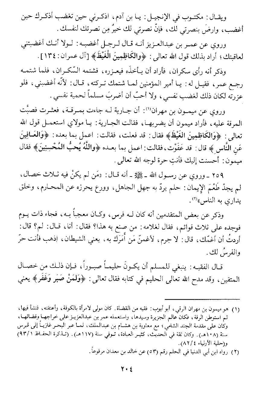 وَرُوِيَ عَنْ مَيْمُونِ بْنِ مِهْرَانَ، أَنْ جَارِيَةً لَهُ جَاءَتْ بِمَرَقَةٍ، فَعَثَرَتْ فَصَبَّتِ الْمَرَقَةَ عَلَيْهِ، فَأَرَادَ مَيْمُونُ أَنْ يَضْرِبَهَا، فَقَالَتِ الْجَارِيَةُ: يَا مَوْلَايَ، اسْتَعْمِلْ قَوْلَ اللَّهِ تَعَالَى: {وَالْكَاظِمِينَ الْغَيْظَ} [آل عمران: 134] ، فَقَالَ: قَدْ فَعَلْتُ.