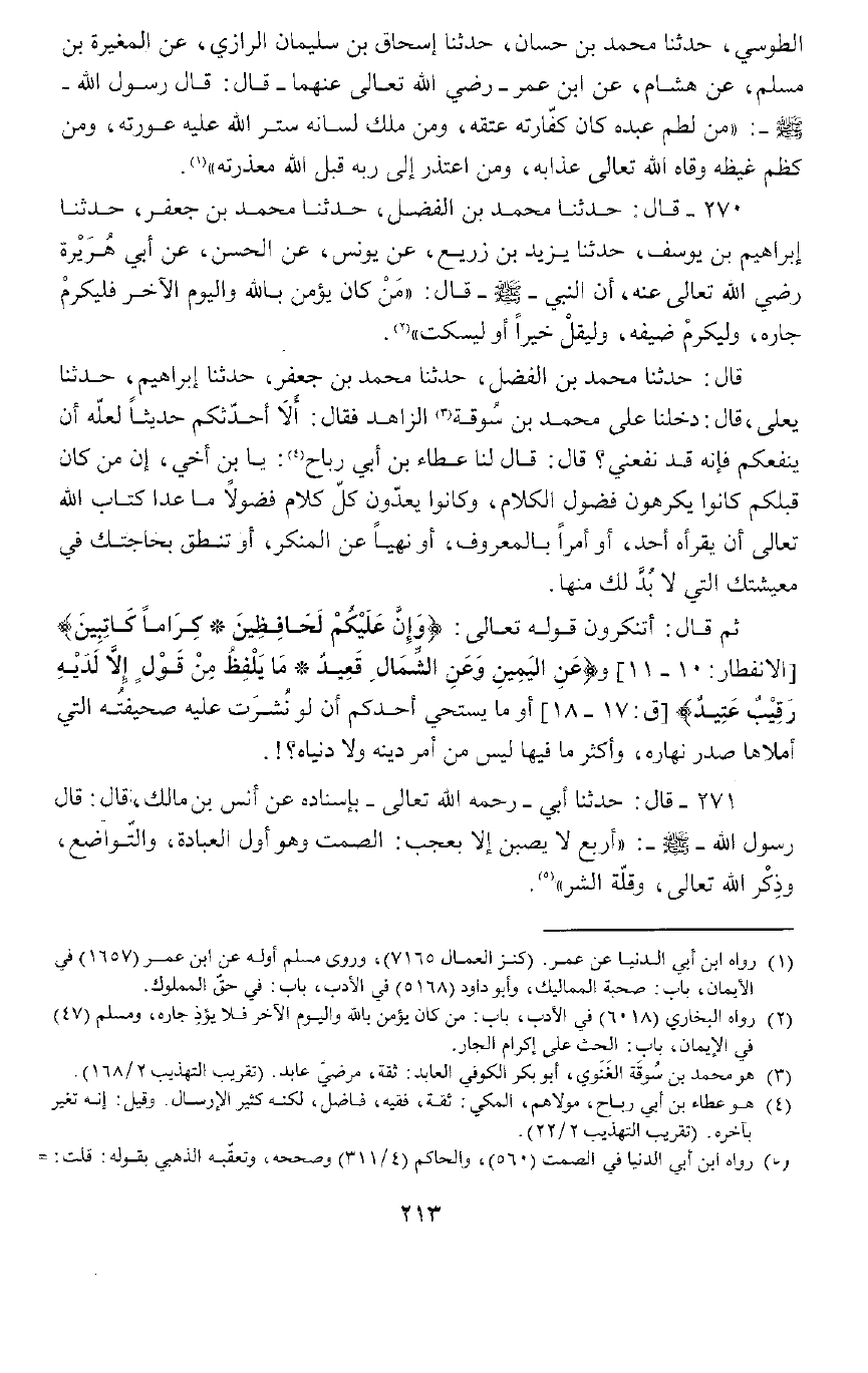 270 - قَالَ: حَدَّثَنَا مُحَمَّدُ بْنُ الْفَضْلِ، حَدَّثَنَا مُحَمَّدُ بْنُ جَعْفَرٍ، حَدَّثَنَا إِبْرَاهِيمُ بْنُ يُوسُفَ، حَدَّثَنَا يَزِيدُ بْنُ زُرَيْعٍ , عَنْ يُونُسَ , عَنِ الْحَسَنِ , عَنْ أَبِي هُرَيْرَةَ رَضِيَ اللَّهُ تَعَالَى عَنْهُ , أَنَّ النَّبِيَّ صَلَّى اللَّهُ عَلَيْهِ وَسَلَّمَ , قَالَ: «مَنْ كَانَ يُؤْمِنُ بِاللَّهِ وَالْيَوْمِ الْآخِرِ فَلْيُكْرِمْ جَارَهُ، وَلْيُكْرِمْ ضَيْفَهُ، وَلْيَقُلْ خَيْرًا أَوْ لِيَسْكُتْ»