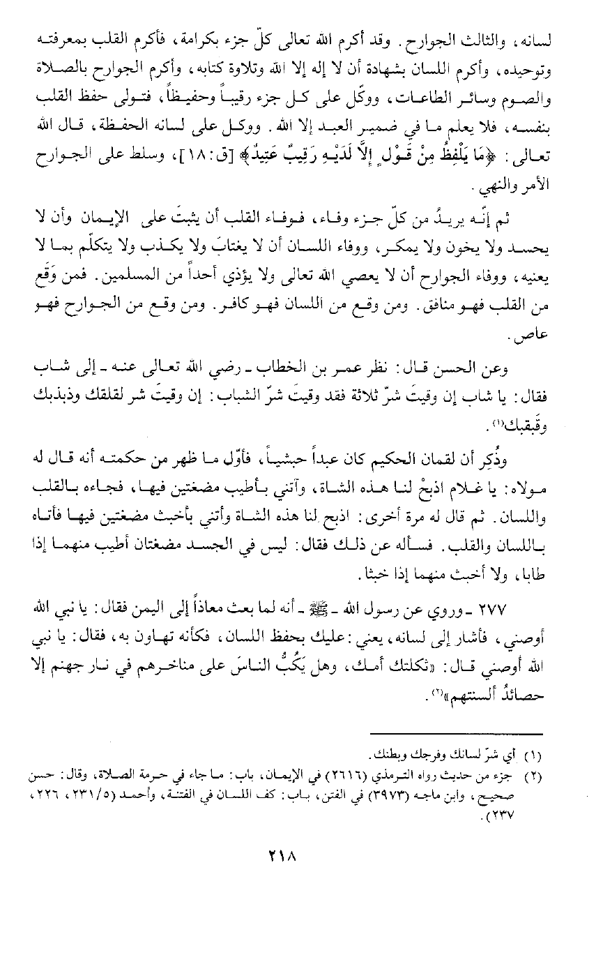 وَهَلْ يَكُبُّ النَّاسَ فِي نَارِ جَهَنَّمَ إِلَّا حَصَائِدُ أَلْسِنَتِهِمْ» .