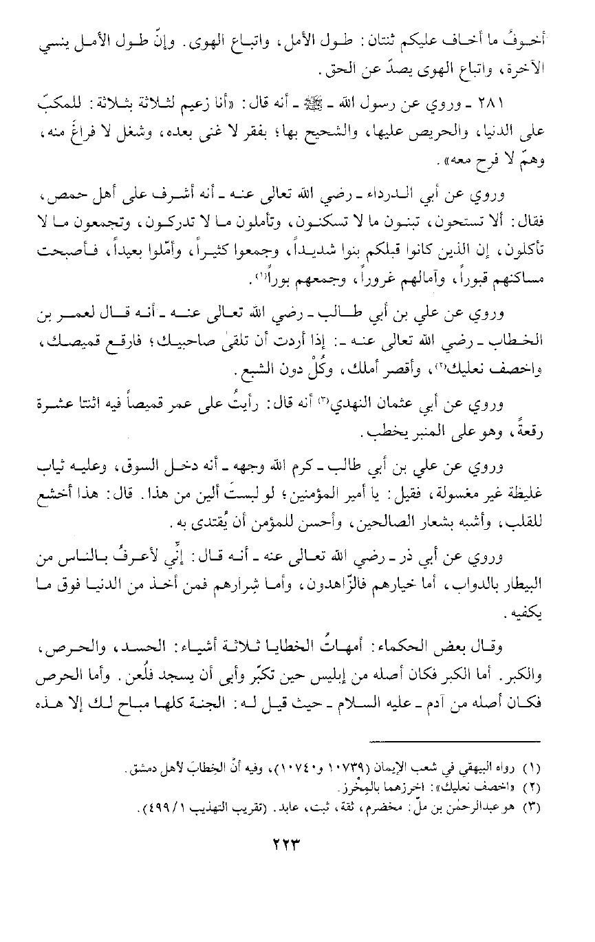 281 - وَرُوِيَ عَنْ رَسُولِ اللَّهِ صَلَّى اللَّهُ عَلَيْهِ وَسَلَّمَ , أَنَّهُ قَالَ: " أَنَازَعْتُمْ لِثَلَاثَةٍ بِثَلَاثَةٍ: لِلْمُكِبِّ عَلَى الدُّنْيَا، وَالْحَرِيصِ عَلَيْهَا، وَالشَّحِيحِ بِهَا بِفَقْرٍ لَا غِنًى بَعْدَهُ، وَشُغْلٍ لَا فَرَاغَ مِنْهُ وَهَمٍّ لَا فَرَحَ مَعَهُ ".