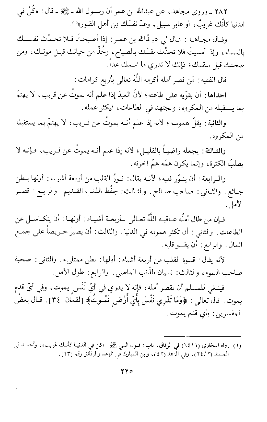 282 - وَرَوَى مُجَاهِدٌ , عَنْ عَبْدِ اللَّهِ بْنِ عُمَرَ , أَنّ رَسُولَ اللَّهِ صَلَّى اللَّهُ عَلَيْهِ وَسَلَّمَ , قَالَ: «كُنْ فِي الدُّنْيَا كَأَنَّكَ غَرِيبٌ أَوْ عَابِرُ سَبِيلٍ، وَعُدَّ نَفْسَكَ مِنْ أَهْلِ الْقُبُورِ» .