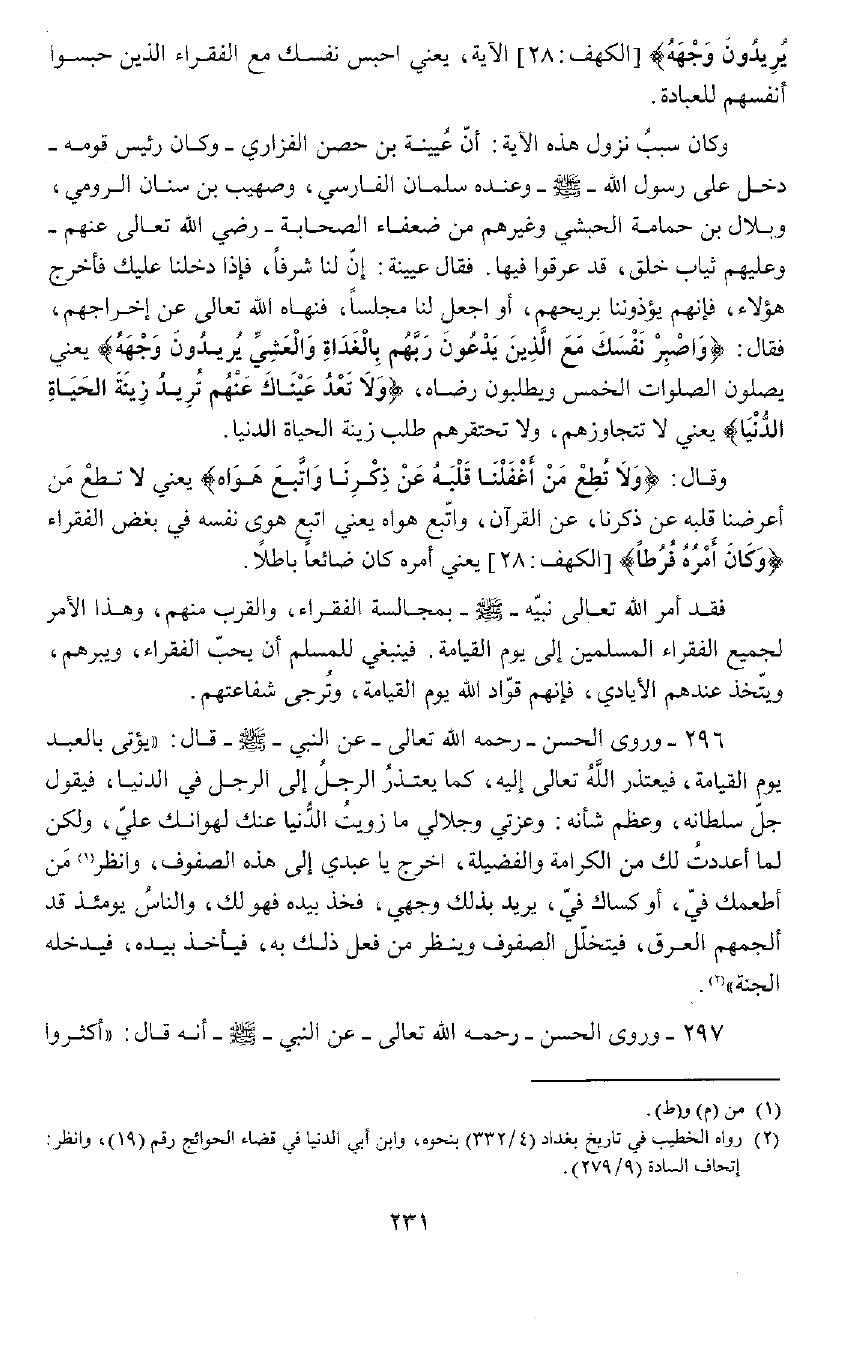 فَقَدْ أَمَرَ اللَّهُ تَعَالَى نَبِيَّهُ صَلَّى اللَّهُ عَلَيْهِ وَسَلَّمَ بِمُجَالَسَةِ الْفُقَرَاءِ وَالْقُرْبِ مِنْهُمْ وَهَذَا الْأَمْرُ لِجَمِيعِ الْفُقَرَاءِ الْمُسْلِمِينَ إِلَى يَوْمِ الْقِيَامَةِ فَيَنْبَغِي لِلْمُسْلِمِ أَنْ يُحِبَّ الْفُقَرَاءَ وَيَبَرَّهُمْ وَيَتَّخِذَ عِنْدَهُمُ الْأَيَادِيَ، فَإِنَّهُمْ قُوَّادُ اللَّهِ يَوْمَ الْقِيَامَةِ، وَتُرْجَى شَفَاعَتُهُمْ
