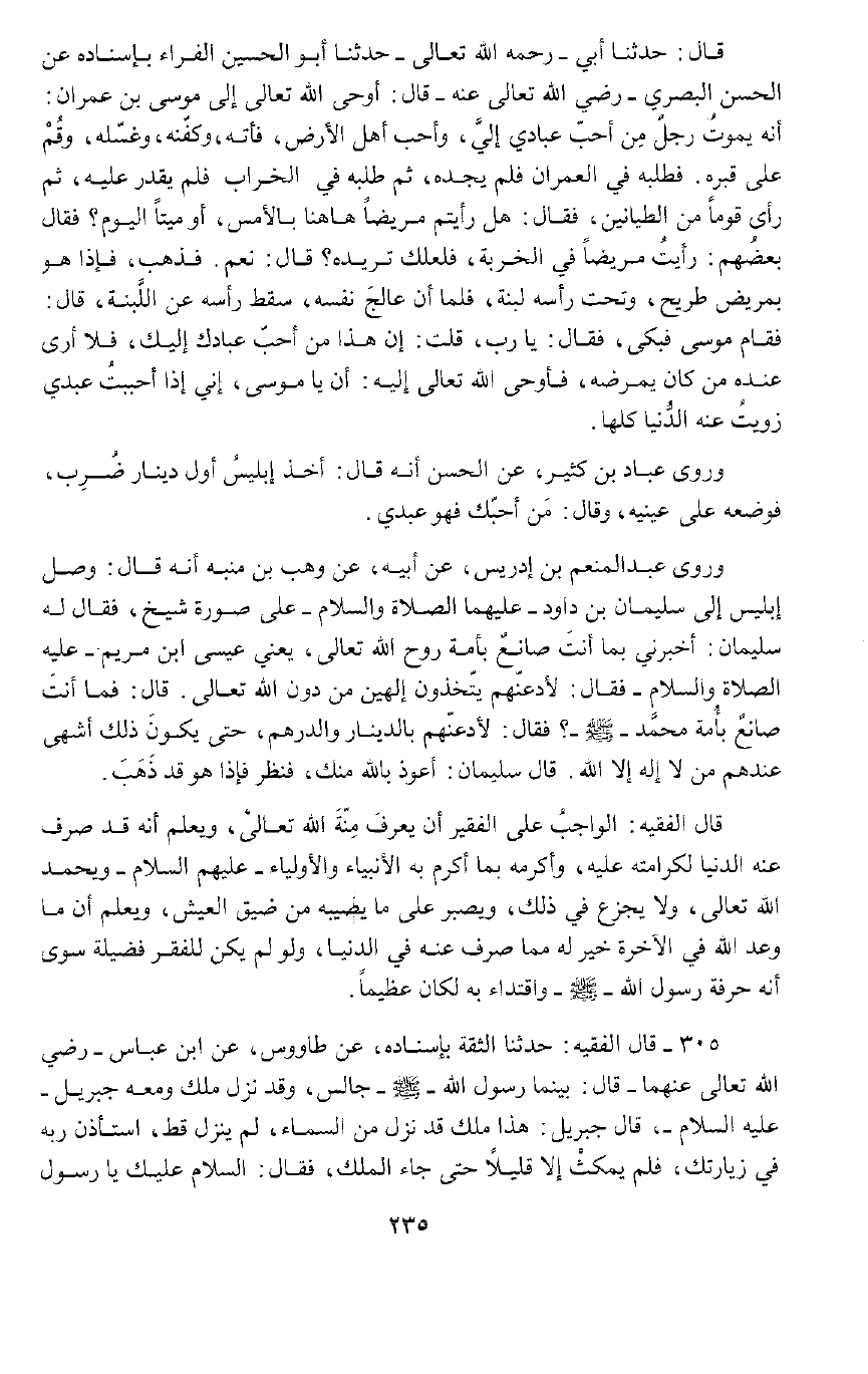 قَالَ: حَدَّثَنَا أَبِي رَحِمَهُ اللَّهُ تَعَالَى، حَدَّثَنَا أَبُو الْحَسَنِ الْفَرَّاءُ بِإِسْنَادِهِ، عَنِ الْحَسَنِ الْبَصْرِيِّ رَضِيَ اللَّهُ تَعَالَى عَنْهُ , قَالَ: " أَوْحَى اللَّهُ تَعَالَى إِلَى مُوسَى بْنِ عِمْرَانَ: أَنَّهُ يَمُوتُ رَجُلٌ مِنْ أَحَبِّ عِبَادِي إِلَيَّ، وَأَحَبِّ أَهْلِ الْأَرْضِ فَائْتِهِ وَغَسِّلْهُ وَقُمْ عَلَى قَبْرِهِ فَطَلَبَهُ فِي الْعُمْرَانِ فَلَمْ يَجِدْهُ.