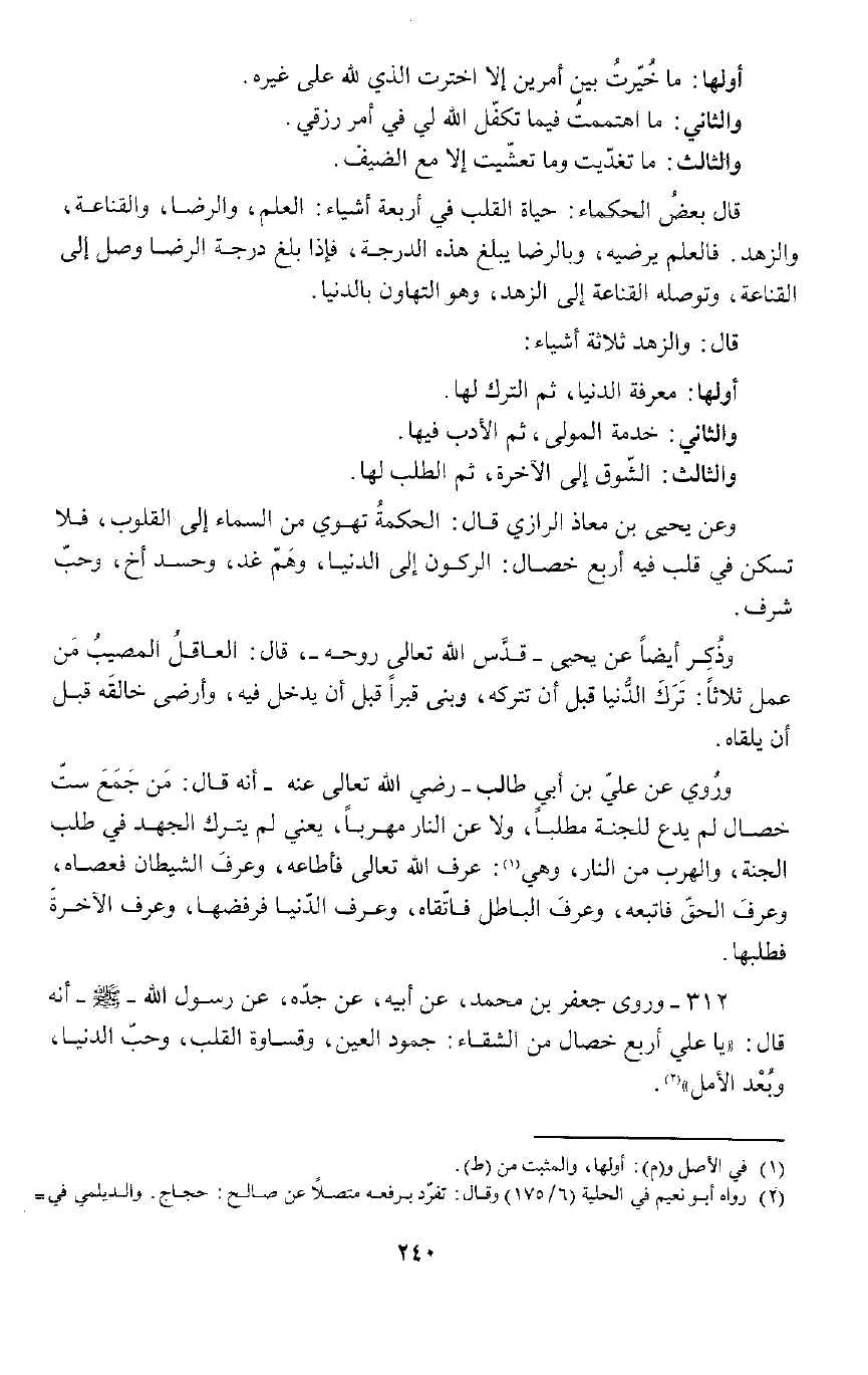 قَالَ بَعْضُ الْحُكَمَاءِ: حَيَاةُ الْقَلْبِ فِي أَرْبَعَةِ أَشْيَاءَ: الْعِلْمِ وَالرِّضَا وَالْقَنَاعَةِ وَالزُّهْدِ.