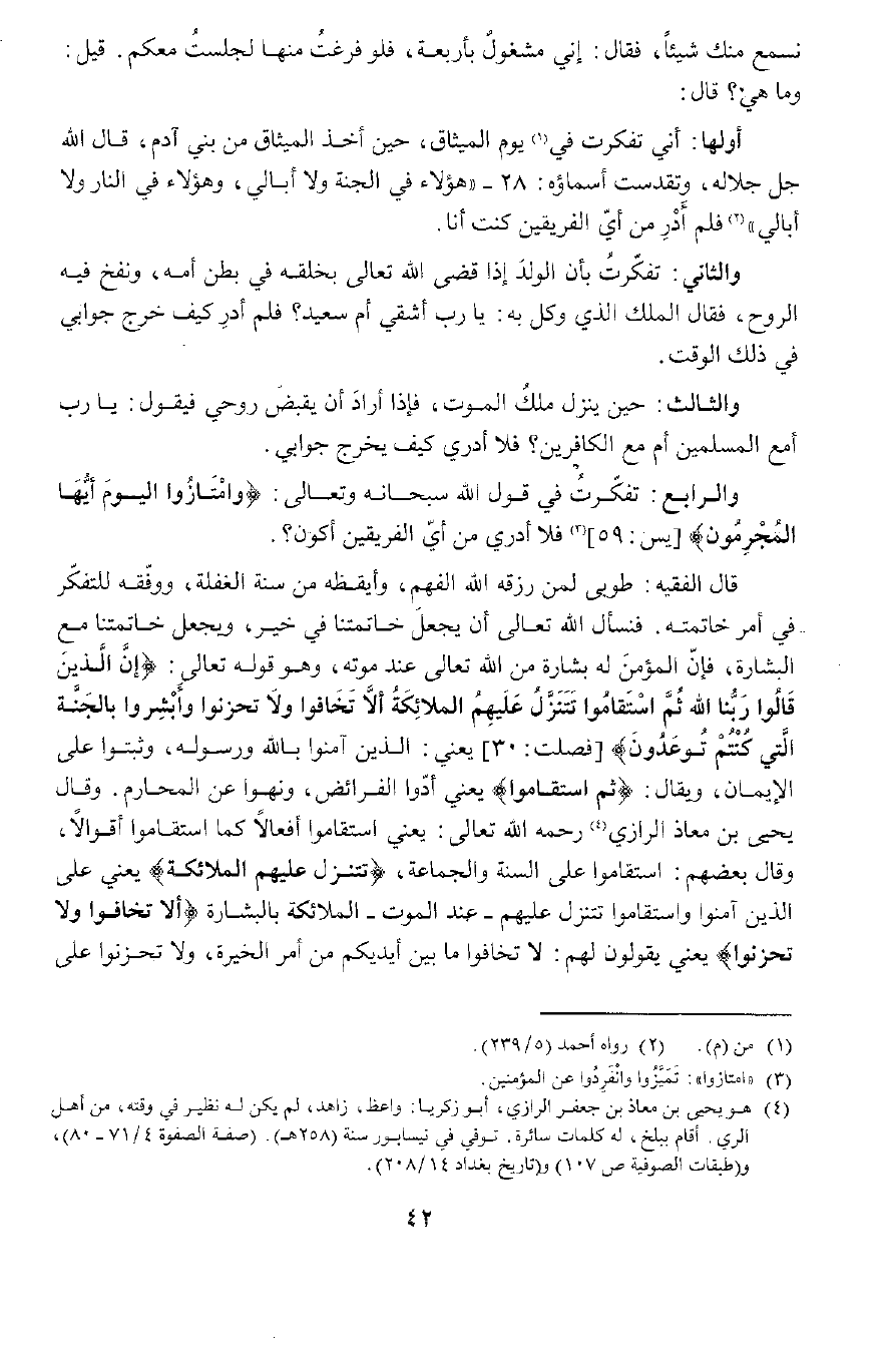 نَسْمَعَ مِنْكَ شَيْئًا، فَقَالَ: إِنِّي مَشْغُولٌ بِأَرْبَعَةِ أَشْيَاءَ فَلَوْ فَرَغْتُ مِنْهَا لَجَلَسْتُ مَعَكُمْ، قِيلَ: وَمَا هِيَ؟ قَالَ: أَوَّلُهَا أَنِّي تَفَكَّرْتُ يَوْمَ الْمِيثَاقِ حِينَ أُخِذَ الْمِيثَاقُ مِنْ بَنِي آدَمَ، قَالَ اللَّهُ تَعَالَى جَلَّ جَلَالُهُ وَتَقَدَّسَتْ أَسْمَاؤُهُ، هَؤُلَاءِ فِي الْجَنَّةِ وَلَا أُبَالِي وَهَؤُلَاءِ فِي النَّارِ وَلَا أُبَالِي، فَلَمْ أَدْرِ مِنْ أَيِّ الْفَرِيقَيْنِ كُنْتُ أَنَا، وَالثَّانِي تَفَكَّرْتُ بِأَنَّ الْوَلَدِ إِذَا قَضَى اللَّهُ تَعَالَى بِخَلْقِهِ فِي بَطْنِ أُمِّهِ وَنُفِخَ فِيهِ الرُّوحُ، فَقَالَ الْمَلَكُ الَّذِي وُكِّلَ بِهِ: يَا رَبِّ أَشَقِيٌّ أَمْ سَعِيدٌ، فَلَمْ أَدْرِ كَيْفَ خَرَجَ جَوَابِي فِي ذَلِكَ الْوَقْتِ، وَالثَّالِثُ حِينَ يَنْزِلُ مَلَكُ الْمَوْتِ، فَإِذَا أَرَادَ أَنْ يَقْبِضَ رُوحِي فَيَقُولُ: يَا رَبِّ أَمَعَ الْمُسْلِمينَ أَمْ مَعَ الْكَافِرِينَ، فَلَا أَدْرِي كَيْفَ يَخْرُجُ جَوَابِي، وَالرَّابِعُ تَفَكَّرْتُ فِي قَوْلِ اللَّهِ سُبْحَانَهُ وَتَعَالَى: {وَامْتَازُوا الْيَوْمَ أَيُّهَا الْمُجْرِمُونَ} [يس: 59] ، فَلَا أَدْرِي مِنْ أَيِّ الْفَرِيقَيْنِ أَكُونُ.