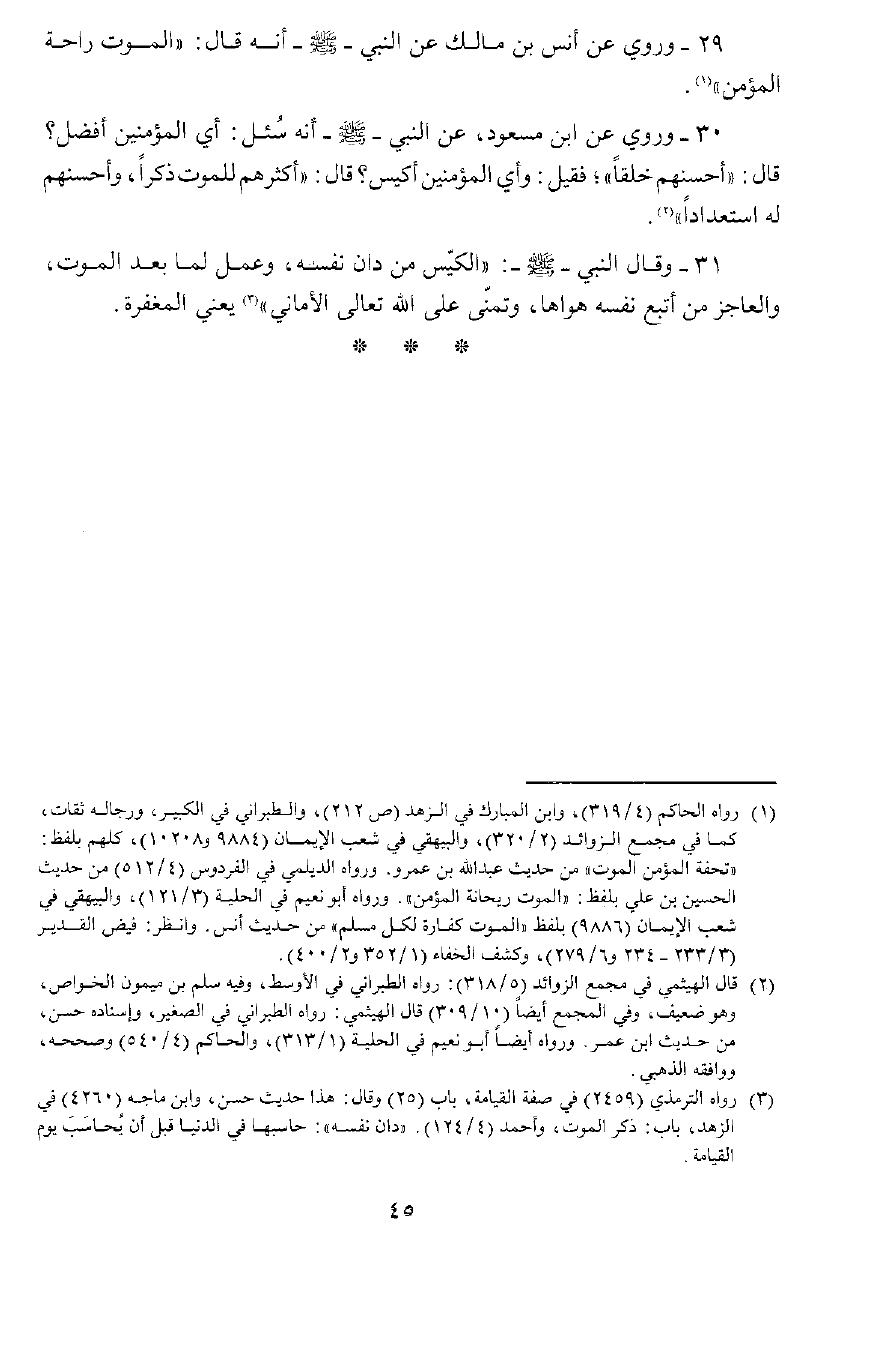 31 - قَالَ النَّبِيُّ صَلَّى اللَّهُ عَلَيْهِ وَسَلَّمَ: «الْكَيِّسُ مَنْ دَانَ نَفْسَهُ وَعَمِلَ لِمَا بَعْدَ الْمَوْتِ، وَالْفَاجِرُ مَنْ أَتْبَعَ نَفْسَهُ هَوَاهَا وَتَمَنَّى عَلَى اللَّهِ تَعَالَى الْأَمَانِيَّ» يَعْنِي الْمَغْفِرَةَ