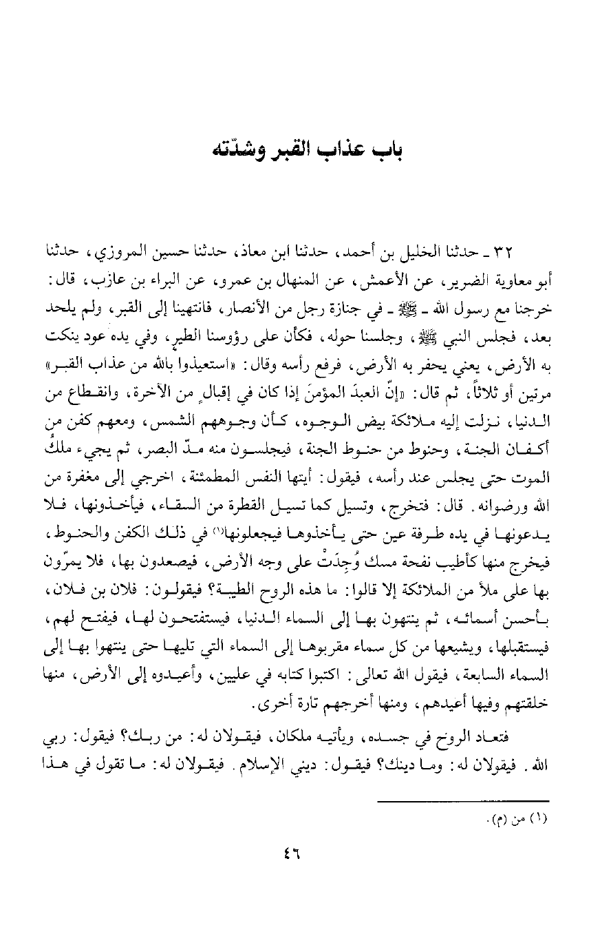 32 - حَدَّثَنَا الْخَلِيلُ بْنُ أَحْمَدَ، حَدَّثَنَا ابْنُ مُعَاذٍ، حَدَّثَنَا حُسَيْنٌ الْمَرْوَزِيُّ، حَدَّثَنَا أَبُوَ مُعَاوِيَةَ الضَّرِيرُ , عَنِ الْأَعْمَشِ، عَنِ الْمِنْهَالِ بْنِ عَمْرٍو، عَنِ الْبَرَاءِ بْنِ عَازِبٍ , قَالَ: خَرَجْنَا مَعَ رَسُولِ اللَّهِ صَلَّى اللَّهُ عَلَيْهِ وَسَلَّمَ فِي جِنَازَةِ رَجُلٍ مِنَ الْأَنْصَارِ فَانْتَهَيْنَا إِلَى الْقَبْرِ وَلَمْ يُلْحَدْ بَعْدُ، فَجَلَسَ النَّبِيُّ صَلَّى اللَّهُ عَلَيْهِ وَسَلَّمَ وَجَلَسْنَا حَوْلَهُ، فَكَأَنَّ عَلَى رُءُوسِنَا الطَّيْرُ، وَفِي يَدِهِ عُودٌ يَنْكُتُ بِهِ الْأَرْضَ، يَعْنِي يَحْفُرُ بِهِ الْأَرْضَ، فَرَفَعَ رَأْسَهُ وَقَالَ: «اسْتَعِيذُوا بِاللَّهِ مِنْ عَذَابِ الْقَبْرِ» مَرَّتَيْنِ أَوْ ثَلَاثًا ثُمَّ قَالَ: " إِنَّ الْعَبْدَ الْمُؤْمِنَ إِذَا كَانَ فِي إِقْبَالٍ مِنَ الْآخِرَةِ وَانْقِطَاعٍ مِنَ الدُّنْيَا نَزَلَتْ إِلَيْهِ مَلَائِكَةٌ بِيضٌ وُجُوهُهُمْ، كَالشَّمْسِ، وَمَعَهُمْ كَفَنٌ مِنَ الْجَنَّةِ، وَحَنُوطٌ مِنْ حَنُوطِ الْجَنَّةِ، فَيَجْلِسُونَ مَدَّ الْبَصَرِ، ثُمَّ يَجِئُ مَلَكُ الْمَوْتِ حَتَّى يَجْلِسَ عِنْدَ رَأْسِهِ فَيَقُولُ: أَيَّتُهَا النَّفْسُ الْمُطْمَئِنَّةُ اخْرُجِي إِلَى مَغْفِرَةِ اللَّهِ وَرِضْوَانِهِ ".