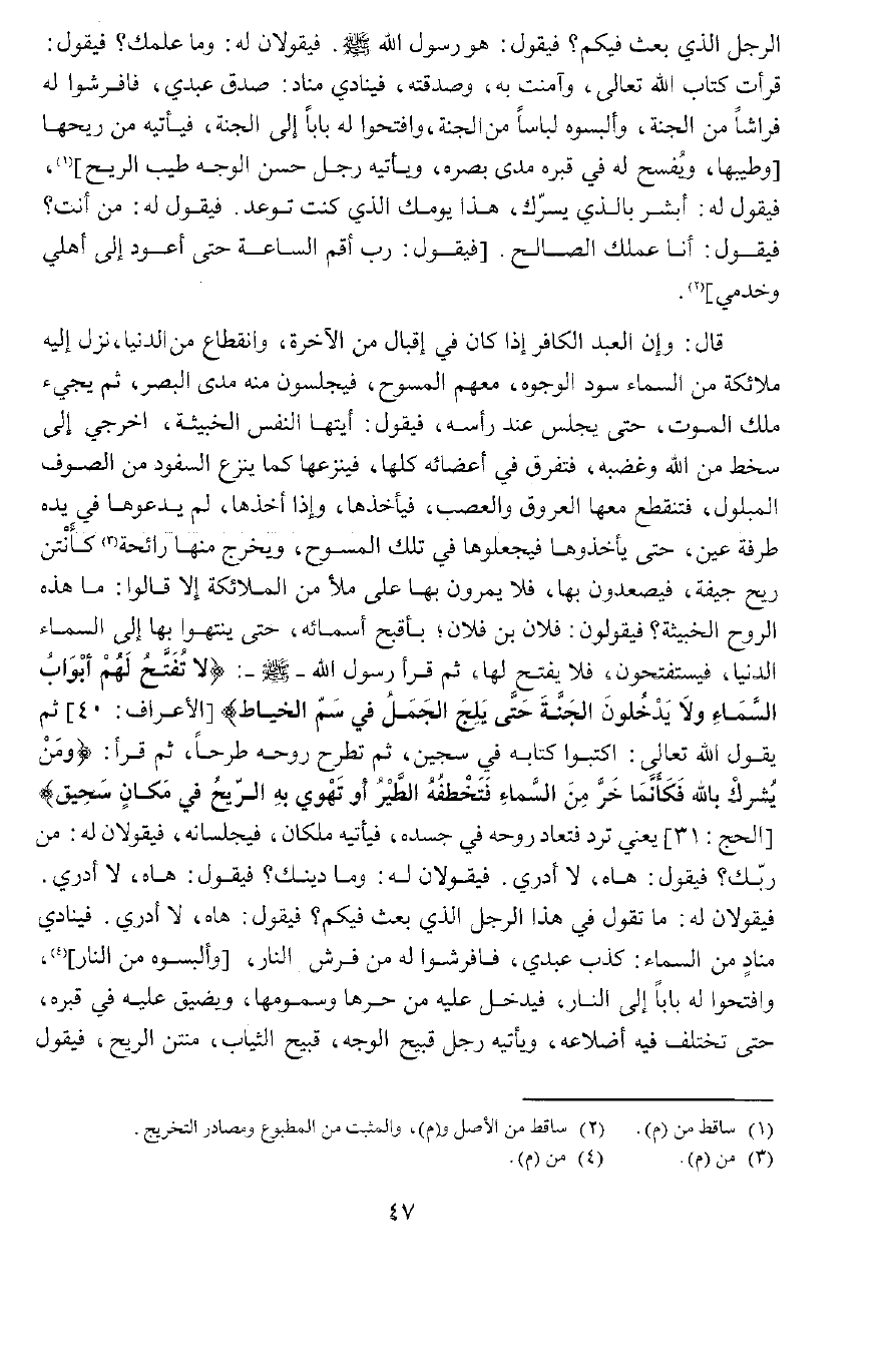 قَالَ النَّبِيُّ صَلَّى اللَّهُ عَلَيْهِ وَسَلَّمَ: " وَإِنَّ الْعَبْدَ الْكَافِرَ إِذَا كَانَ فِي إِقْبَالٍ مِنَ الْآخِرَةِ، وَانْقِطَاعٍ مِنَ الدُّنْيَا، نَزَلَ إِلَيْهِ مَلَائِكَةٌ مِنَ السَّمَاءِ سُودُ الْوُجُوهِ، مَعَهُمُ الْمُسُوحُ، فَيَجْلِسُونَ مِنْهُ مَدَّ الْبَصَرِ، ثُمَّ يَجِئُ مَلَكُ الْمَوْتِ حَتَّى يَجْلِسَ عِنْدَ رَأْسِهِ فَيَقُولُ: أَيَّتُهَا النَّفْسُ الْخَبِيثَةُ اخْرُجِي إِلَى سَخَطِ اللَّهِ وَغَضَبِهِ، فَتَتَفَرَّقُ فِي أَعْضَائِهِ كُلِّهَا، فَيَنْزِعُهَا كَمَا يُنْزَعُ السَّفُّودُ مِنَ الصُّوفِ الْمَبْلُولِ، فَيَنْقَطِعُ مَعَهَا الْعُرُوقُ وَالْعَصَبُ فَيَأْخُذُوهَا، وَإِذَا أَخَذُوهَا لَمْ يَدَعُوهَا فِي يَدِهِ طَرْفَةَ عَيْنٍ حَتَّى يَأْخُذُوهَا فَيَجْعَلُوهَا فِي تِلْكَ الْمُسُوِحِ، وَيَخْرُجُ مِنْهَا كَأَنْتَنِ رِيحِ جِيفَةٍ، فَيَصْعَدُونَ بِهَا فَلَا يَمُرُّونَ بِهَا عَلَى مَلَإٍ مِنَ الْمَلَائِكَةِ إِلَّا قَالُوا: مَا هَذِهِ الرُّوحُ الْخَبِيثَةُ، فَيَقُولُونَ رُوحُ فُلَانِ ابْنِ فُلَانٍ، بِأَقْبَحِ أَسْمَائِهِ، حَتَّى يَنْتَهُوا بِهَا إِلَى سَمَاءِ الدُّنْيَا فَيَسْتَفْتِحُونَ فَلَا يُفْتَحُ لَهَا ".