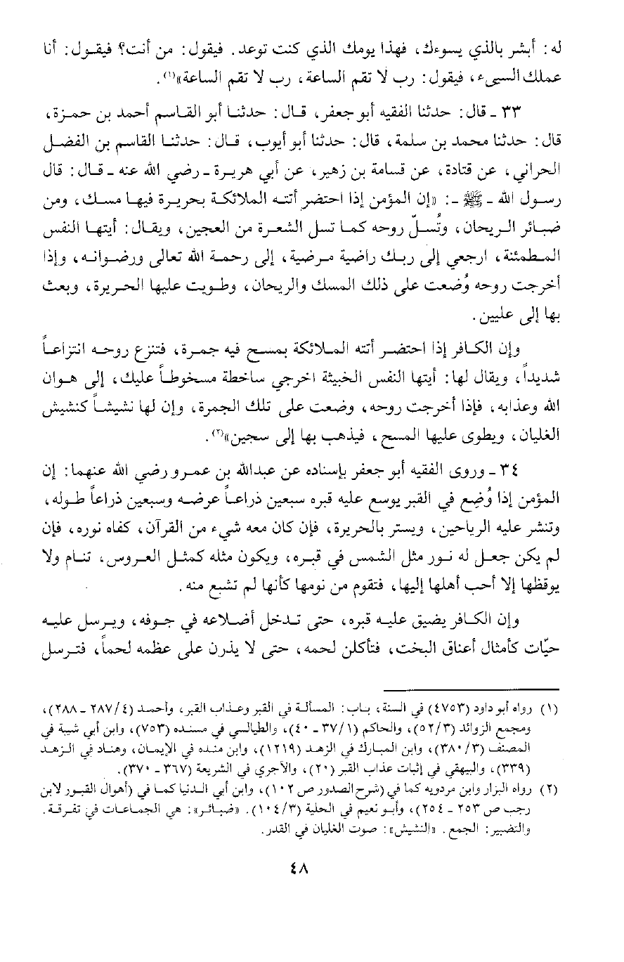 34 - قَالَ، وَرَوَى الْفَقِيهُ أَبُو جَعْفَرٍ , بِإِسْنَادِهِ عَنْ عَبْدِ اللَّهِ بْنِ عُمَرَ رَضِيَ اللَّهُ عَنْهُمَا , " أَنَّ الْمُؤْمِنَ إِذَا وُضِعَ فِي الْقَبْرِ يُوَسَّعُ عَلَيْهِ فِي قَبْرِهِ سَبْعُونَ ذِرَاعًا طُولًا، وَتُنْشَرُ عَلَيْهِ الرَّيَاحِينُ، وَيُسْتَرُ بِالْحَرِيرِ فَإِنْ كَانَ مَعَهُ شَيْءٌ مِنَ الْقُرْآنِ كَفَاهُ نُورُهُ، فَإِنْ لَمْ يَكُنْ جُعِلَ لَهُ نُورٌ مِثْلُ الشَّمْسِ فِي قَبْرِهِ، وَيَكُونُ مَثَلُهُ كَمَثَلِ الْعَرُوسِ، تَنَامُ وَلَا يُوقِظُهَا إِلَّا أَحَبُّ أَهْلِهَا إِلَيْهَا، فَتَقُومُ مِنْ نَوْمِهَا كَأَنَّهَا لَمْ تَشْبَعْ مِنْهُ، وَإِنَّ الْكَافِرَ يَضِيقُ عَلَيْهِ قَبْرُهُ حَتَّى تَدْخُلَ أَضْلَاعُهُ فِي جَوْفِهِ، وَيُرْسَلُ عَلَيْهِ حَيَّاتٌ كَأَمْثَالِ أَعْنَاقِ الْبُخْتِ فَيَأْكُلْنَ لَحْمَهُ حَتَّى لَا يَذَرْنَ عَلَى عَظْمِهِ لَحْمًا،