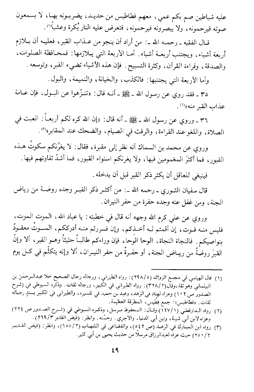 مَنْ أَرَادَ أَنْ يَنْجُوَ مِنْ عَذَابِ الْقَبْرِ فَعَلَيْهِ أَنْ يُلَازِمَ أَرْبَعَةَ أَشْيَاءَ وَيَجْتَنِبَ أَرْبَعَةَ أَشْيَاءَ: فَأَمَّا الْأَرْبَعَةُ الَّتِي يُلَازِمُهَا فَمُحَافَظَةُ الصَّلَوَاتِ وَالصَّدَقَةُ وَقِرَاءَةُ الْقُرْآنِ وَكَثْرَةُ التَّسْبِيحِ.