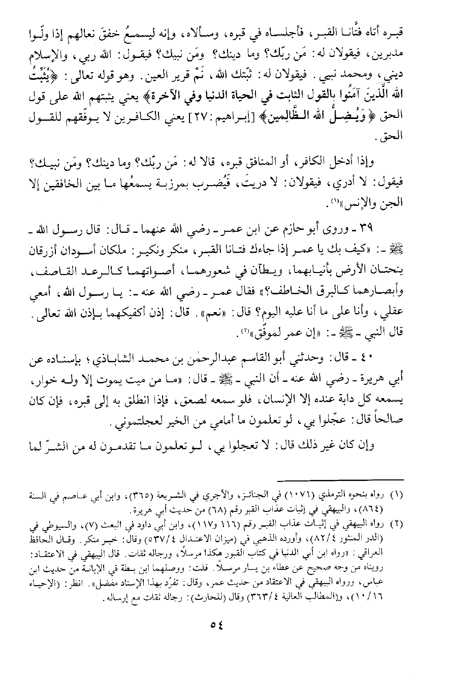 39 - وَرَوَى أَبُو حَازِمٍ , عَنْ ابْنِ عُمَرَ رَضِيَ اللَّهُ عَنْهُمَا , قَالَ، قَالَ رَسُولُ اللَّهِ صَلَّى اللَّهُ عَلَيْهِ وَسَلَّمَ: «يَا عُمَرُ كَيْفَ بِكَ إِذَا جَاءَكَ فَتَّانَا الْقَبْرِ مُنْكَرٌ وَنَكِيرٌ، مَلَكَانِ أَسْوَدَانِ أَزْرَقَانِ يَنْحِتَانِ الْأَرْضَ بِأَنْيَابِهِمَا، وَيَطَآنِ فِي شُعُورِهِمَا، أَصْوَاتُهُمَا كَالرَّعْدِ الْقَاصِفِ وَأَبْصَارُهُمَا كَالْبَرْقِ الْخَاطِفِ» .