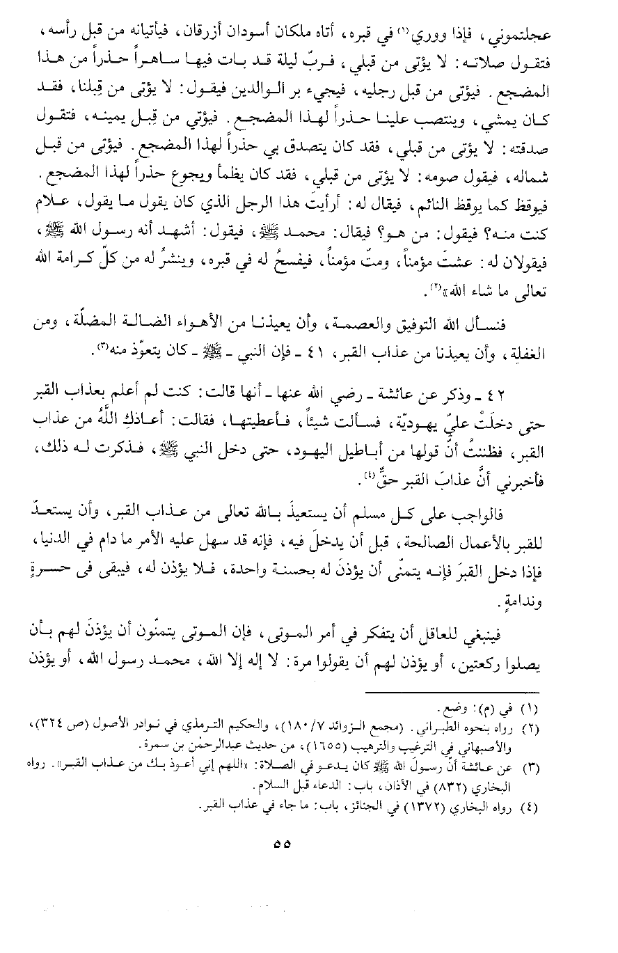 42 - وَذُكِرَ عَنْ عَائِشَةَ رَضِيَ اللَّهُ عَنْهَا أَنَّهَا قَالَتْ كُنْتُ لَمْ أَعْلَمَ بِعَذَابِ الْقَبْرِ حَتَّى دَخَلَتْ عَلَيَّ يَهُودِيَّةٌ فَسَأَلَتْ شَيْئًا فَأَعْطَيْتُهَا فَقَالَتْ أَعَاذَكِ اللَّهُ مِنْ عَذَابِ الْقَبْرِ، فَظَنَنْتُ أَنَّ قَوْلَهَا مِنْ أَبَاطِيلِ الْيَهُودِ، حَتَّى دَخَلَ النَّبِيُّ صَلَّى اللَّهُ عَلَيْهِ وَسَلَّمَ فَذَكَرْتُ ذَلِكَ لَهُ، فَأَخْبَرَنِي أَنَّ عَذَابَ الْقَبْرِ حَقٌّ، فَالْوَاجِبُ عَلَى كُلِّ مُسْلِمٍ أَنْ يَسْتَعِيذَ بِاللَّهِ تَعَالَى مِنْ عَذَابِ الْقَبْرِ، وَأَنْ يَسْتَعِدَّ لِلْقَبْرِ بِالْأَعْمَالِ الصَّالِحَةِ قَبْلَ أَنْ يَدْخُلَ فِيهِ، فَإِنَّهُ قَدْ سَهُلَ عَلَيْهِ الْأَمْرُ مَا دَامَ فِي الدُّنْيَا، فَإِذَا دَخَلَ الْقَبْرَ فَإِنَّهُ يَتَمَنَّى أَنْ يُؤْذَنَ لَهُ بِحَسَنَةٍ وَاحِدَةٍ، فَلَا يُؤْذَنُ لَهُ، فَيَبْقَى فِي حَسْرَةٍ وَنَدَامَةٍ.