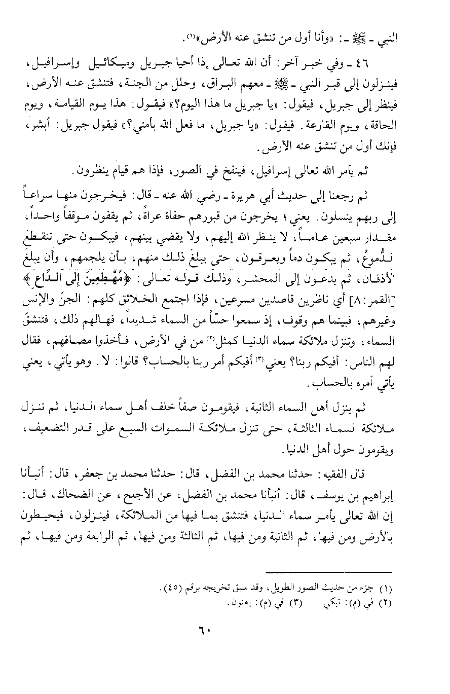 46 - وَفِي خَبَرٍ آخَرَ أَنَّ اللَّهَ تَعَالَى إِذَا أَحْيَا جِبْرِيلَ وَمِيكَائِيلَ وَإِسْرَافِيلَ، فَيَنْزِلُونَ إِلَى قَبْرِ النَّبِيِّ صَلَّى اللَّهُ عَلَيْهِ وَسَلَّمَ وَمَعَهُمُ الْبُرَاقُ وَحُلَلٌ مِنَ الْجَنَّةِ فَتَنْشَقُّ عَنْهُ الْأَرْضُ فَيَنْظُرُ النَّبِيُّ صَلَّى اللَّهُ عَلَيْهِ وَسَلَّمَ إِلَى جِبْرِيلَ فَيَقُولُ: «يَا جِبْرِيلُ مَا هَذَا الْيَوْمُ» ؟ فَيَقُولُ هَذَا يَوْمُ الْقِيَامَةِ، هَذَا يَوْمُ الْحَاقَّةِ، هَذَا يَوْمُ الْقَارِعَةِ، فَيَقُولُ: «يَا جِبْرِيلُ مَا فَعَلَ اللَّهُ بِأُمَّتِي» فَيَقُولُ جِبْرِيلُ أَبْشِرْ فَإِنَّكَ أَوَّلُ مَنْ تَنْشَقُّ عَنْهُ الْأَرْضُ.
