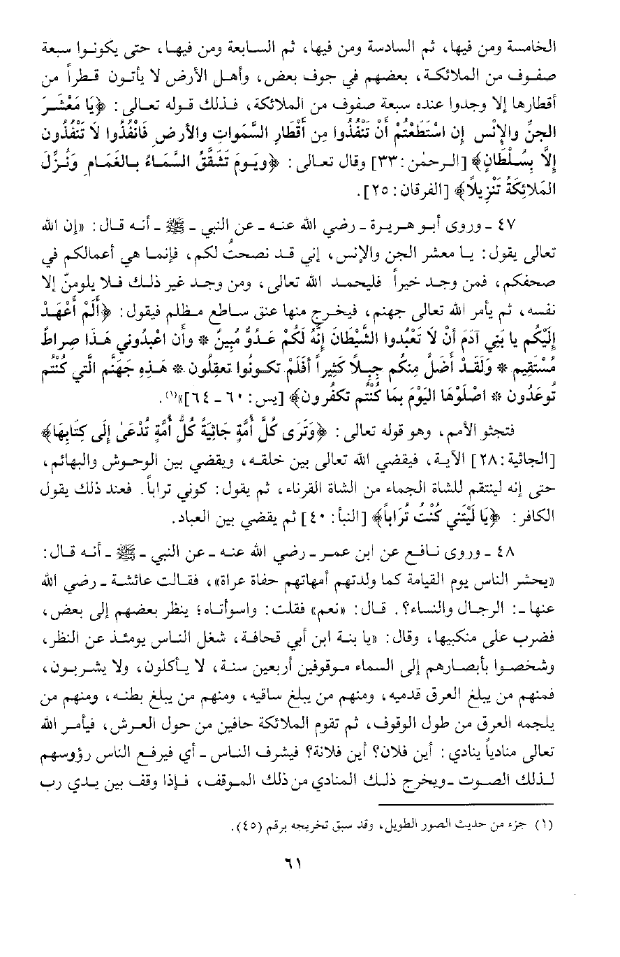 47 - وَرَوَى أَبُوَ هُرَيْرَةَ رَضِيَ اللَّهُ عَنْهُ , عَنِ النَّبِيِّ صَلَّى اللَّهُ عَلَيْهِ وَسَلَّمَ , أَنَّهُ قَالَ: " إِنَّ اللَّهَ تَعَالَى يَقُولُ: يَا مَعْشَرَ الْجِنِّ وَالْإِنْسِ إِنِّي نَصَحْتُ لَكُمْ، فَإِنَّمَا هِيَ أعَمَالُكُمْ فِي صُحُفِكُمْ، فَمَنْ وَجَدَ خَيْرًا فَلْيَحْمَدِ اللَّهَ تَعَالَى، وَمَنْ وَجَدَ غَيْرَ ذَلِكَ فَلَا يَلُومَنَّ إِلَّا نَفْسَهُ "، ثُمَّ يَأْمُرُ اللَّهُ تَعَالَى جَهَنَّمَ فَيَخْرُجُ مِنْهَا عُنُقٌ طَوِيلٌ سَاطِعٌ مُظْلِمٌ مُتَكَلِّمًا، فَيَقُولُ اللَّهُ {أَلَمْ أَعْهَدْ إِلَيْكُمْ يَا بَنِي آدَمَ أَنْ لا تَعْبُدُوا الشَّيْطَانَ إِنَّهُ لَكُمْ عَدُوٌّ مُبِينٌ {60} وَأَنِ اعْبُدُونِي هَذَا صِرَاطٌ مُسْتَقِيمٌ {61} وَلَقَدْ أَضَلَّ مِنْكُمْ جِبِلا كَثِيرًا أَفَلَمْ تَكُونُوا تَعْقِلُونَ {62} هَذِهِ جَهَنَّمُ الَّتِي كُنْتُمْ تُوعَدُونَ {63} اصْلَوْهَا الْيَوْمَ بِمَا كُنْتُمْ تَكْفُرُونَ} [يس: 60-64] ، فَتَجْثُو الْأُمَمُ.