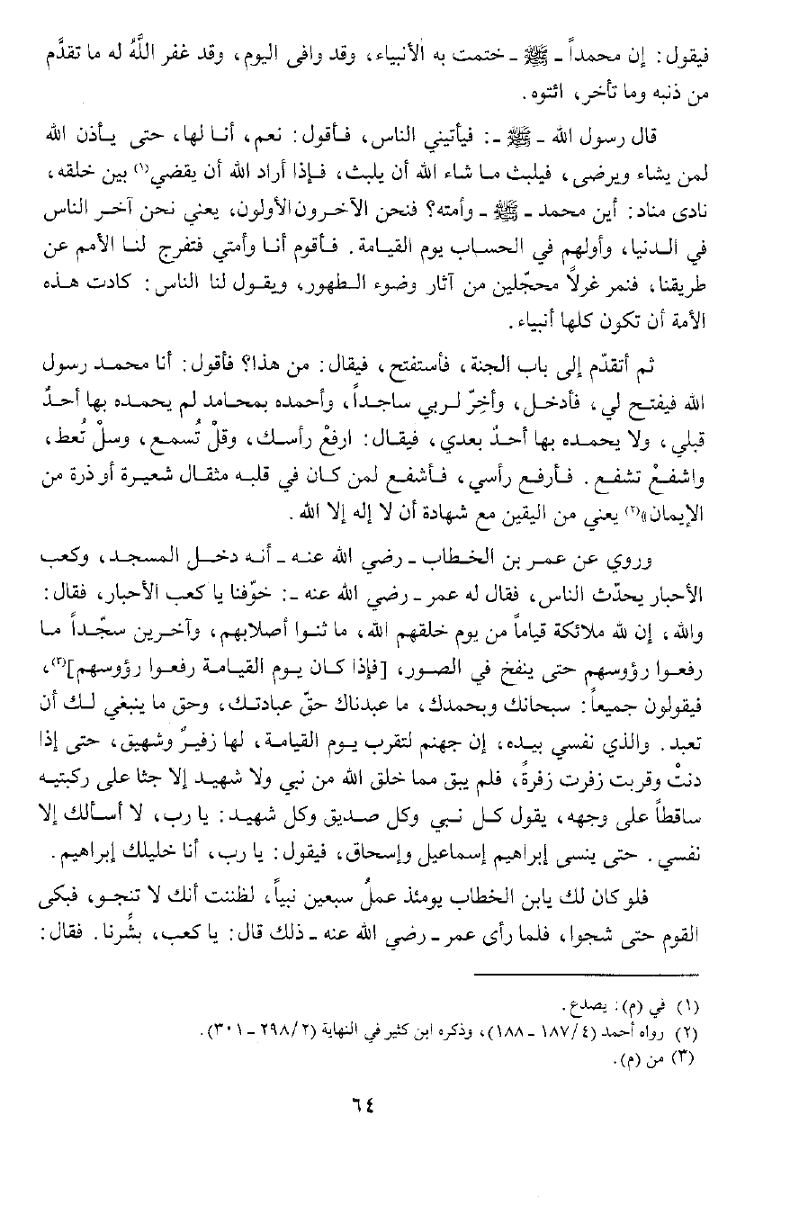 فَيُقَالُ: ارْفَعْ رَأْسَكَ، وَقُلْ تُسْمَعْ، وَسَلْ تُعْطَ، وَاشْفَعْ تُشَفَّعْ، فَأَرْفَعُ رَأْسِي فَأَشْفَعُ لِمَنْ كَانَ فِي قَلْبِهِ مِثْقَالُ شَعِيرَةٍ أَوْ ذَرَّةٍ مِنَ الْإِيمَانِ يَعْنِي مِنَ الْيَقِينِ، مَعَ شِهَادَةِ أَنْ لَا إِلَهَ إِلَّا اللَّهُ وَأَنَّ مُحَمَّدًا رَسُولُ اللَّهِ "