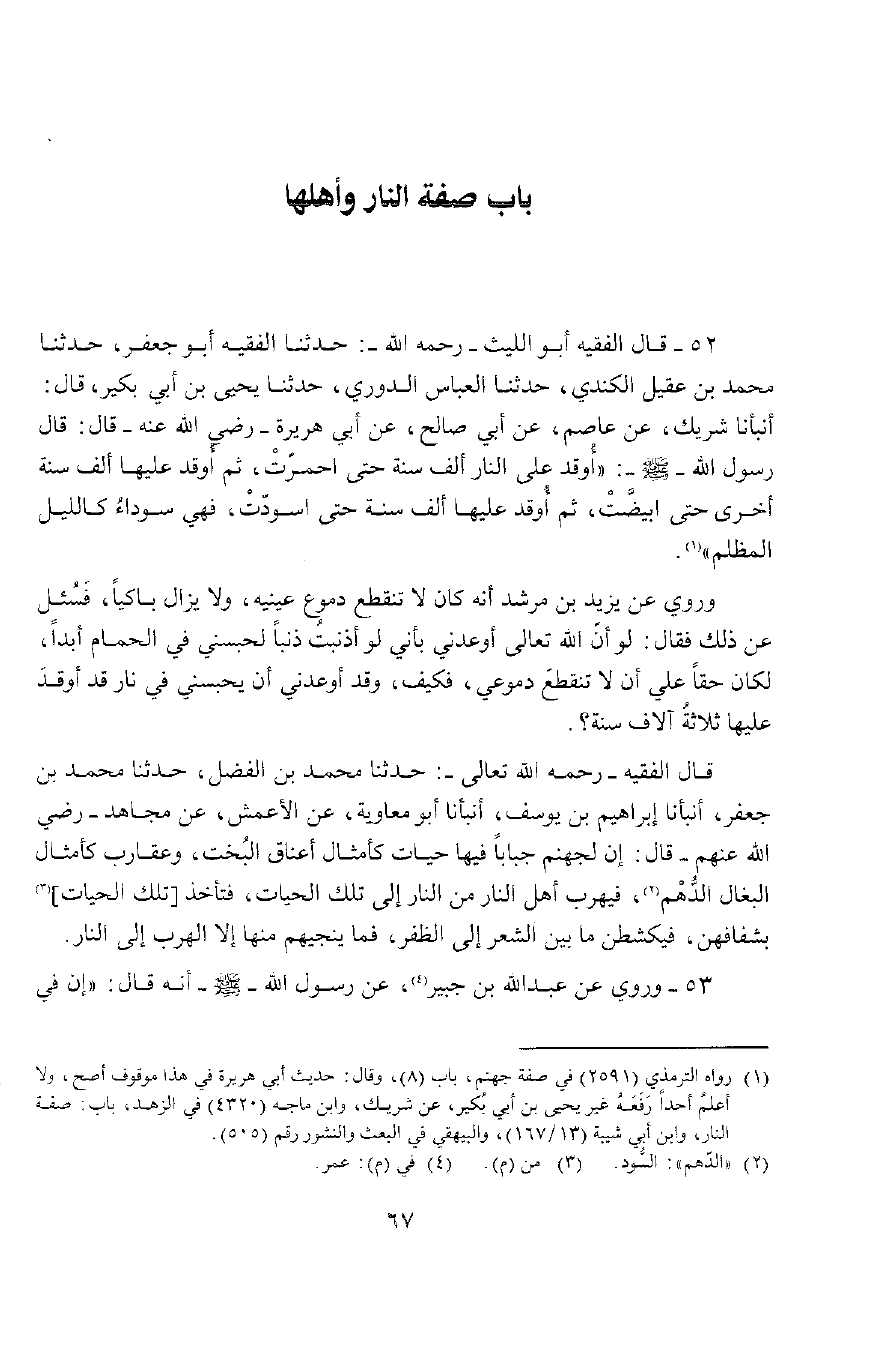52 - حَدَّثَنَا الْفَقِيهُ أَبُو جَعْفَرٍ، حَدَّثَنَا مُحَمَّدُ بْنُ عَقِيلٍ الْكِنْدِيُّ، حَدَّثَنَا الْعَبَّاسُ الدُّورِيُّ، حَدَّثَنَا يَحْيَى بْنُ أَبِي بَكْرٍ , قَالَ: أَنْبَأَنَا شَرِيكٌ، عَنْ عَاصِمٍ، عَنْ أَبِي صَالِحٍ، عَنْ أَبِي هُرَيْرَةَ رَضِيَ اللَّهُ عَنْهُمْ , قَالَ: قَالَ رَسُولُ اللَّهِ صَلَّى اللَّهُ عَلَيْهِ وَسَلَّمَ: «أُوقِدَ عَلَى النَّارِ أَلْفَ سَنَةٍ حَتَّى احْمَرَّتْ، ثُمَّ أُوقِدَ عَلَيْهَا أَلْفَ سَنَةٍ أُخْرَى حَتَّى ابْيَضَّتْ، ثُمَّ أُوقِدَ عَلَيْهَا أَلْفَ سَنَةٍ حَتَّى اسْوَدَّتْ فَهِيَ سَوْدَاءُ كَاللَّيْلِ الْمُظْلِمِ»