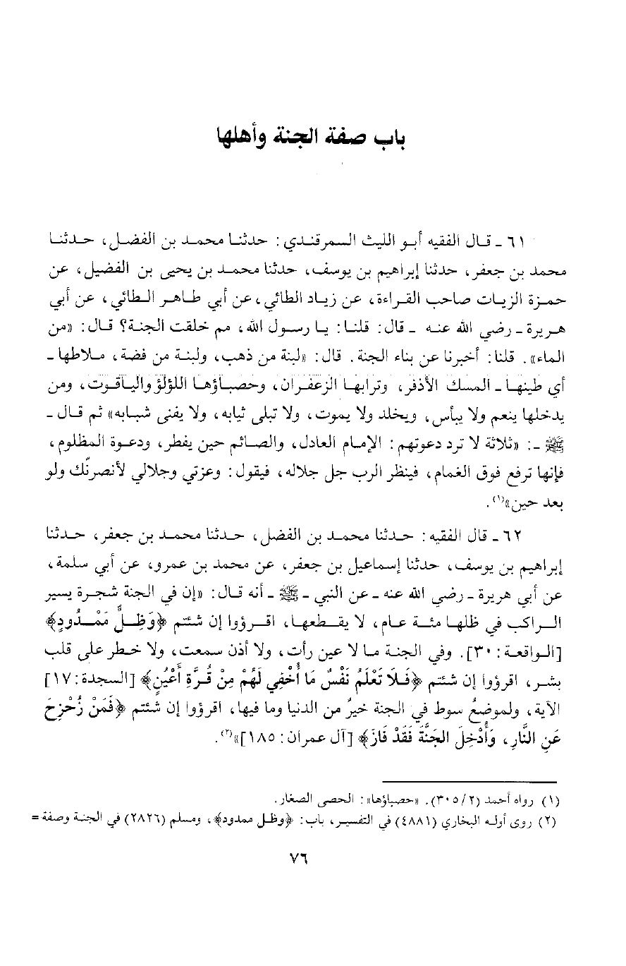 61 - قَالَ: حَدَّثَنَا مُحَمَّدُ بْنُ الْفَضْلِ، حَدَّثَنَا مُحَمَّدُ بْنُ جَعْفَرٍ، حَدَّثَنَا إِبْرَاهِيمُ بْنُ يُوسُفَ، حَدَّثَنَا مُحَمَّدُ بْنُ يَحْيَى بْنُ الْفَضْلِ، عَنْ حَمْزَةَ بْنِ الزِّيَادِ الْكُوفِيِّ، عَنْ زِيَادٍ الطَّائِيِّ، عَنْ أَبِي هُرَيْرَةَ رَضِيَ اللَّهُ عَنْهُ , قَالَ: قُلْنَا: يَا رَسُولَ اللَّهِ مِمَّ خُلِقَتِ الْجَنَّةُ؟ قَالَ: «مِنَ الْمَاءِ» .
