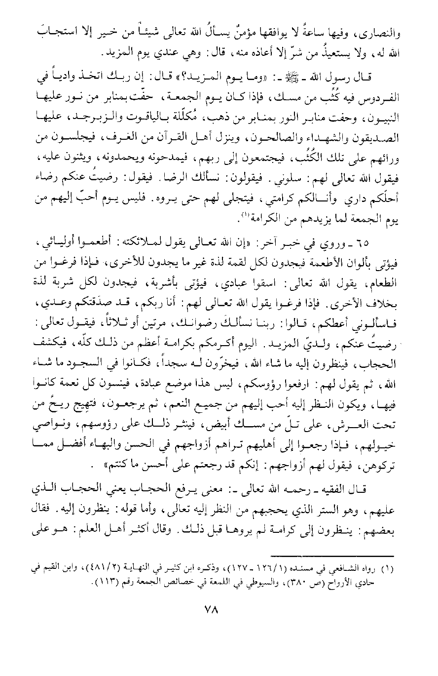 65 - وَرُوِيَ فِي خَبَرٍ آخَرَ أَنَّ اللَّهَ تَعَالَى يَقُولُ لِمَلَائِكَتِهِ أَطْعِمُوا أَوْلِيَائِي، فَيُؤْتَى بِأَلْوَانِ الْأَطْعِمَةِ فَيَجِدُونَ لِكُلِّ لُقْمَةٍ لَذَّةً غَيْرَ مَا يَجِدُونَ لِلْأُخْرَى، فَإِذَا فَرَغُوا مِنَ الطَّعَامِ يَقُولُ اللَّهُ تَعَالَى لَهُمُ اسْقُوا عِبَادِي، فَيُؤْتَى بِأَشْرِبَةٍ فَيَجِدُونَ لِكُلِّ نَفَسٍ لَذَّةً بِخِلَافِ الْأُخْرَى، فَإِذَا فَرَغُوا يَقُولُ اللَّهُ تَعَالَى لَهُمْ: «أَنَا رَبُّكُمْ قَدْ صَدَقْتُكُمْ وَعْدِي، فَاسْأَلُونِي أُعْطِكُمْ» ، قَالُوا: رَبَّنَا نَسْأَلُكَ رِضْوَانَكَ مَرَّتَيْنِ أَوْ ثَلَاثًا، فَيَقُولُ: «قَدْ رَضِيتُ عَنْكُمْ وَلِيَ الْمَزِيدُ، الْيَوْمَ أُكْرِمُكُمْ بِكَرَامَةٍ أَعْظَمَ مِنْ ذَلِكَ كُلِّهِ، فَيُكْشَفُ الْحِجَابُ فَيَنْظُرُونَ إِلَيْهِ مَا شَاءَ اللَّهُ فَيَخِرُّونَ لَهُ سُجَّدًا، فَكَانُوا فِي السُّجُودِ مَا شَاءَ اللَّهُ ثُمَّ يَقُولُ لَهُمُ ارْفَعُوا رُؤُوسَكُمْ لَيْسَ هَذَا مَوْضِعُ عِبَادَةٍ، فَيَنْسَوْنَ كُلَّ نِعْمَةٍ كَانُوا فِيهَا، وَيَكُونُ النَّظَرُ أَحَبَّ إِلَيْهِمْ مِنْ جَمِيعِ النِّعَمِ، ثُمَّ يَرْجِعُونَ فَتَهِيجُ رِيحٌ مِنْ تَحْتِ الْعَرْشِ عَلَى تَلٍّ مِنْ مِسْكٍ أَبْيَضَ، فَيُنْثَرُ ذَلِكَ عَلَى رُءُوسِهِمْ وَنَوَاصِي خُيُولِهِمْ، فَإِذَا رَجَعُوا إِلَى أَهْلِيهِمْ يَرَوْنَهُمْ أَزْوَاجَهُمْ فِي الْحُسْنِ وَالْبَهَاءِ أَفْضَلَ مِمَّا تَرَكُوهُنَّ، فَيَقُولُ لَهُمْ أَزْوَاجُهُمْ إِنَّكُمْ قَدْ رَجَعْتُمْ عَلَى أَحْسَنِ مَا كُنْتُمْ» .