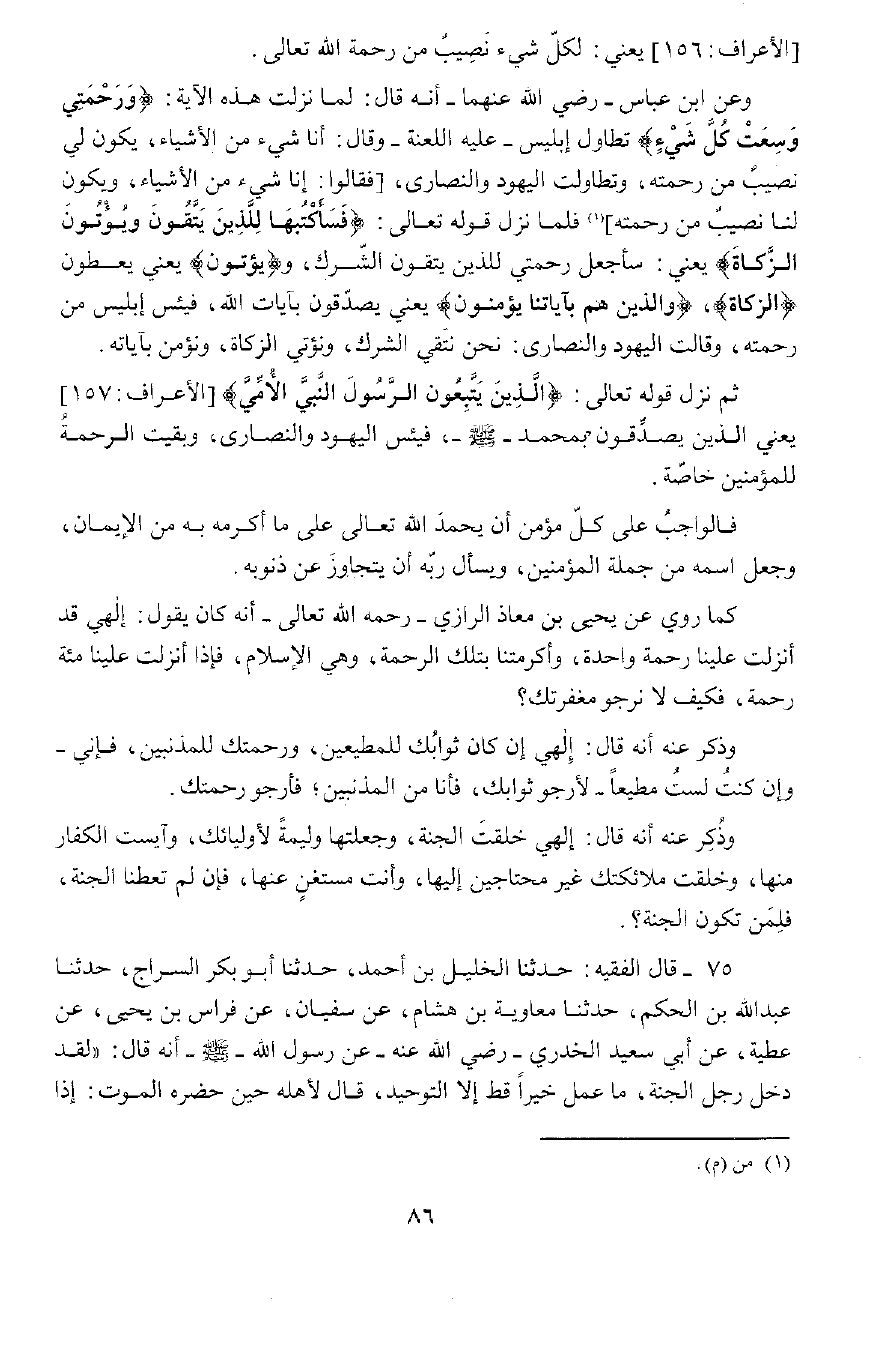 عَنِ ابْنِ عَبَّاسٍ رَضِيَ اللَّهُ عَنْهُمَا , أَنَّهُ قَالَ لَمَّا نَزَلَتِ الآيَةُ: {وَرَحْمَتِي وَسِعَتْ كُلَّ شَيْءٍ} [الأعراف: 156] تَطَاوَلَ إِبْلِيسُ عَلَيْهِ اللَّعْنَةُ وَقَالَ: أَنَا شَيْءٌ مِنَ الْأَشْيَاءِ يَكُونُ لِي نَصِيبٌ مِنْ رَحْمَتِهِ، وَتَطَاوَلَتِ الْيَهُودُ وَالنَّصَارَى، فَلَمَّا نَزَلَ قَوْلُهُ تَعَالَى: {فَسَأَكْتُبُهَا لِلَّذِينَ يَتَّقُونَ وَيُؤْتُونَ الزَّكَاةَ} [الأعراف: 156] يَعْنِي سَأَجْعَلُ رَحْمَتِي لِلَّذِينَ يَتَّقُونَ الشِّرْكَ وَيُؤْتُونَ الزَّكَاةَ، يَعْنِي يُعْطُونَ الزَّكَاةَ وَالَّذِينَ هُمْ بِآيَاتِنَا يُؤْمِنُونَ.