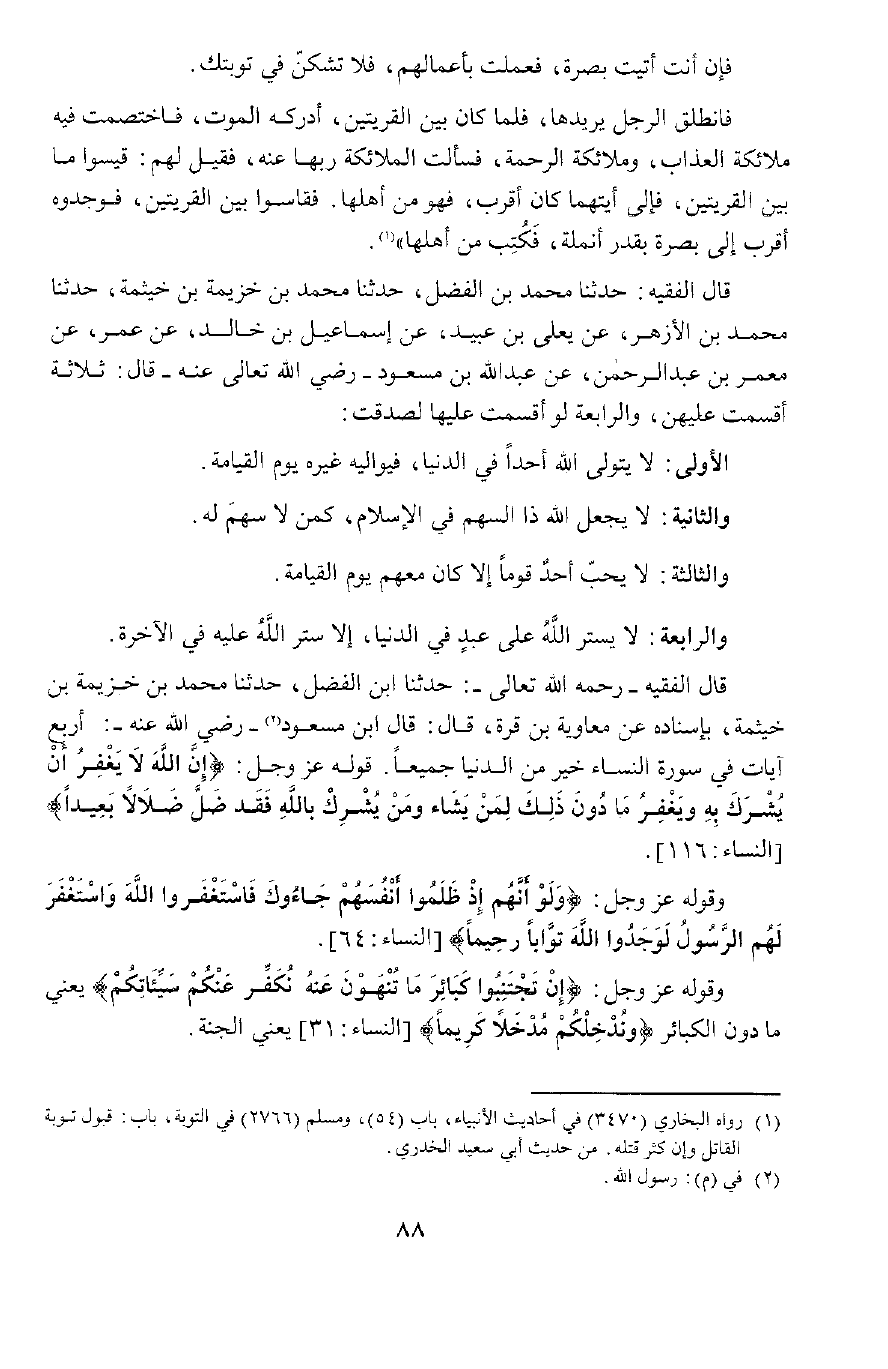 حَدَّثَنَا ابْنُ الْفَضْلِ، حَدَّثَنَا مُحَمَّدُ بْنُ خُزَيْمَةَ بِإِسْنَادِهِ، عَنْ مُعَاوِيَةَ بْنِ قُرَّةَ , قَالَ: قَالَ ابْنُ مَسْعُودٍ رَضِيَ اللَّهُ عَنْهُ: " أَرْبَعُ آيَاتٍ فِي سُورَةِ النِّسَاءِ.