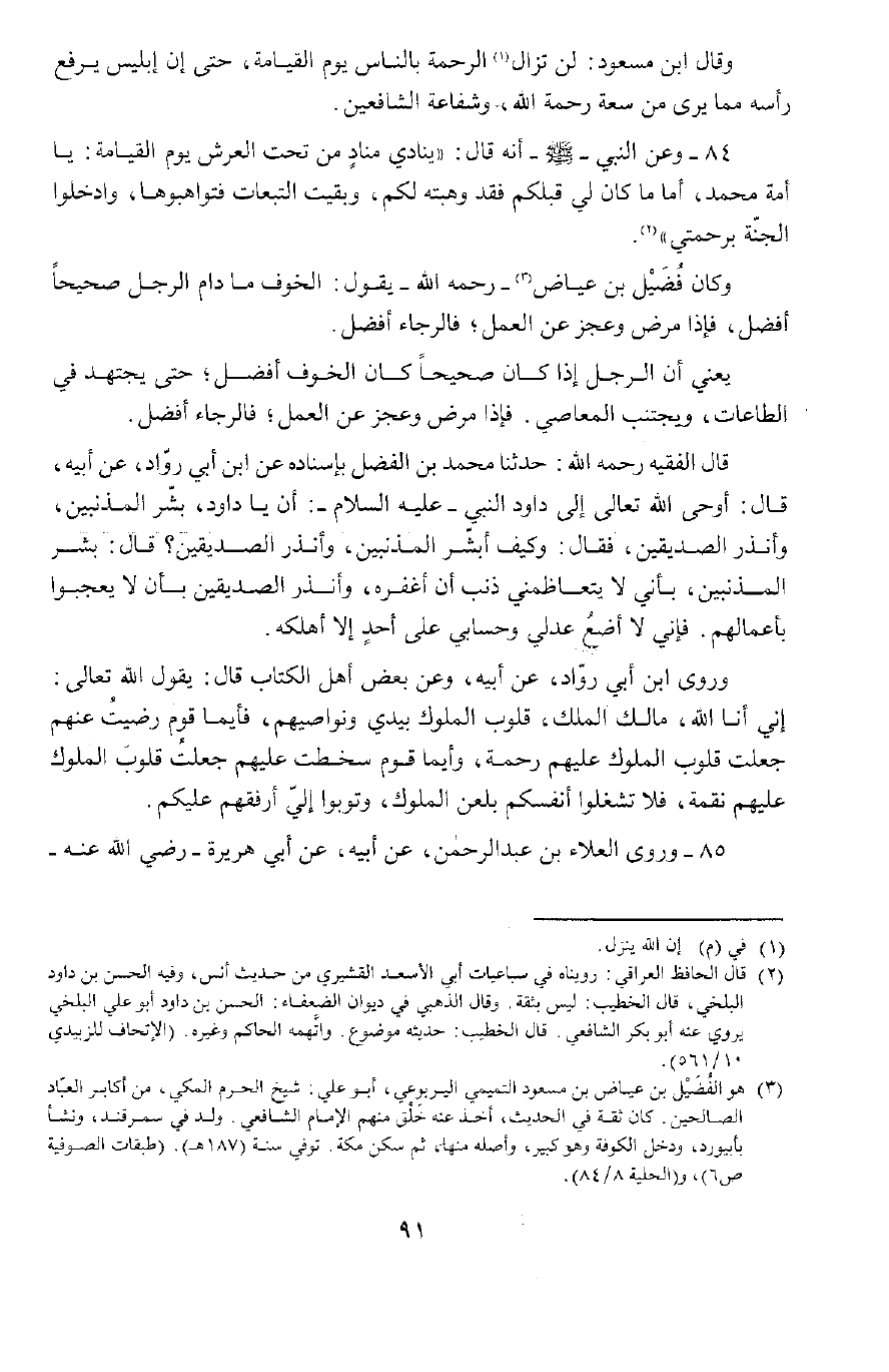 وَكَانَ فُضَيْلُ بْنُ عِيَاضٍ رَحْمَةُ اللَّهِ تَعَالَى عَلَيْهِ , يَقُولُ: الْخَوْفُ مَا دَامَ الرَّجُلُ صَحِيحًا أَفْضَلُ، فَإِذَا مَرِضَ وَعَجَزَ عَنِ الْعَمَلِ فَالرَّجَاءُ أَفْضَلُ، يَعْنِي أَنَّ الرَّجُلَ إِذَا كَانَ صَحِيحًا كَانَ الْخَوْفُ أَفْضَلَ حَتَّى يَجْتَهِدَ فِي الطَّاعَاتِ وَيَجْتَنِبَ الْمَعَاصِي، فَإِذَا مَرِضَ وَعَجَزَ عَنِ الْعَمَلِ كَانَ الرَّجَاءُ لَهُ أَفْضَلَ