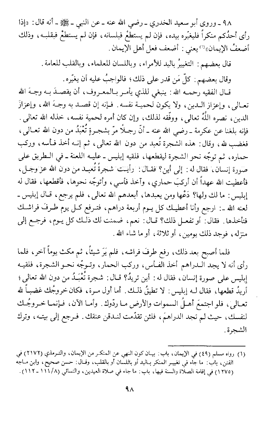 98 - وَرَوَى أَبُو سَعِيدٍ الْخُدْرِيُّ رَضِيَ اللَّهُ تَعَالَى عَنْهُ , عَنِ النَّبِيِّ صَلَّى اللَّهُ عَلَيْهِ وَسَلَّمَ , أَنَّهُ قَالَ: «إِذَا رَأَى أَحَدُكُمْ مُنْكَرًا فَلْيُغَيِّرْهُ بِيَدِهِ، فَإِنْ لَمْ يَسْتَطِعْ فَبِلِسَانِهِ، فَإِنْ لَمْ يَسْتَطِعْ فَبِقَلْبِهِ، وَذَلِكَ أَضْعَفُ الْإِيمَانُ» .