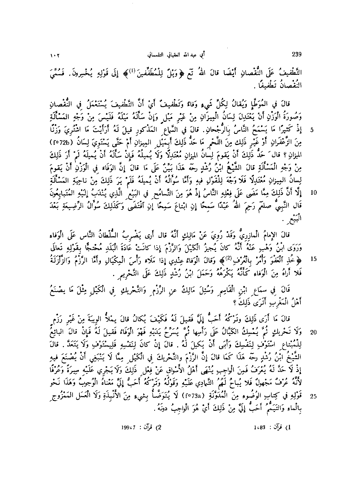 قال في الموطأ ويقال لكل شيء وفاء وتطفيف أي أن التطفيف يستعمل في النقصان وصورة الوزن أن يعتدل لسان الميزان من غير ميل وإن سأله ميله فليس من وجه المسألة إذ كثيرًا ما يسمح الناس بالرجحان. قال في السماع المذكور قيل له أرأيت ما اشتري وزنا من الزعفران أو غير ذلك من اللحم ما حد ذلك أبميل الميزان أم حتى يستوي لسان الميزان؟ قال حد ذلك أن يقوم لسان الميزان معتدلا ولا يميله فإن سأله أن يميله لم أر ذلك من وجه المسألة قال الشيخ ابن رشد رحه هذا بين على ما قال إن الوفاء في الوزن أن يقوم لسان لميزان معتدلا فلا وجه للقول فيه وأما سؤاله أن يميله فم ير ذلك من ناحية المسألة إلا أن ذلك مما مضى على فعله الناس إذ هو من التسامح في البيع الذي يندب إليه المتبايعون قال النبي صلعم رحم الله عبدا سمحا إن ابتاع سمحا إن اقتضى وكذلك سؤال الرضيعة بعد البيع.