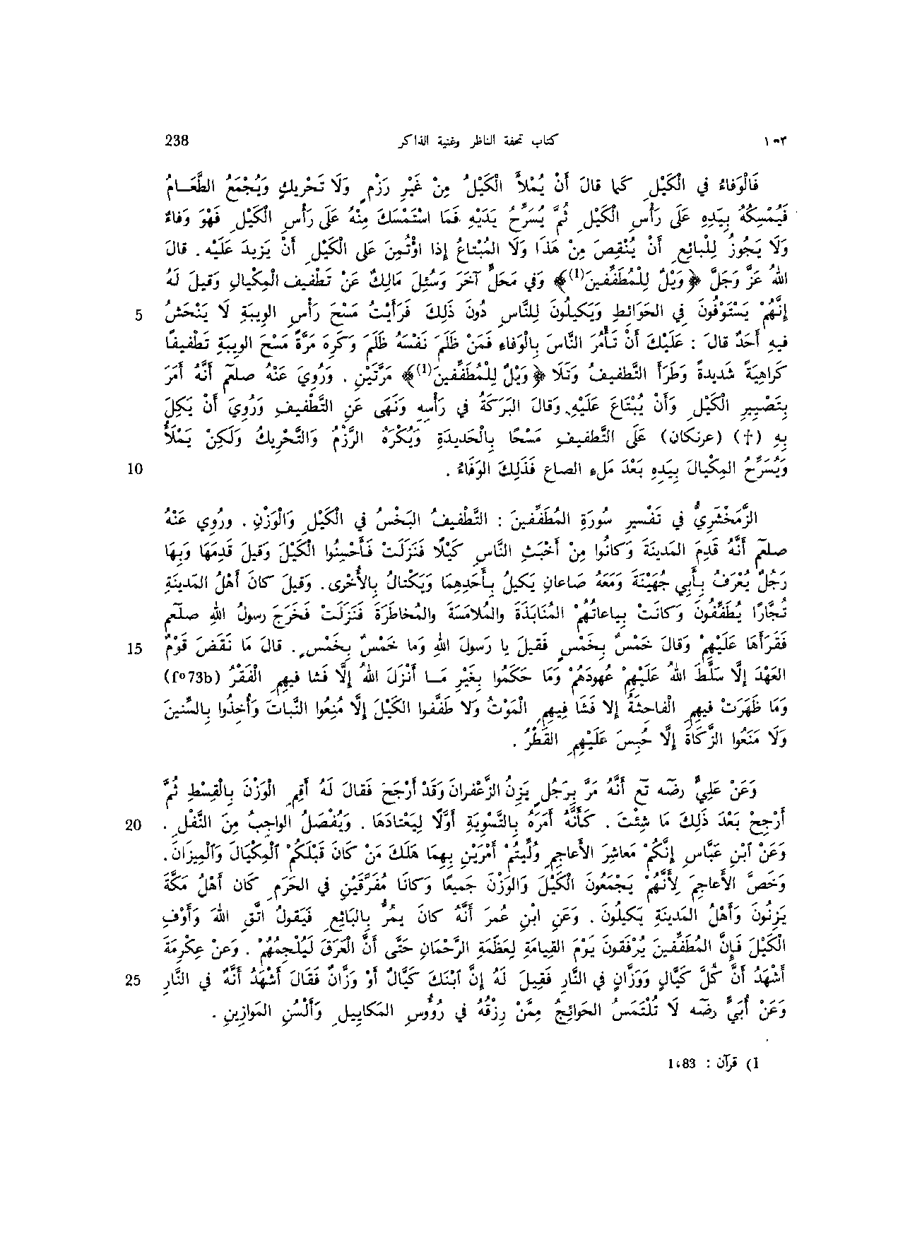 الزمخشري في تفسير سورة المطففين: التطفيف البخس في الكيل والوزن. وروي عنه صلعم أنه قدم المدينة وكانوا من أخبث الناس كيلا فنزلت فأحسنوا الكيل وقيل قدمها وبها رجل يعرف بأبي جهينة ومعه صاعان يكيل بأحدهما ويكتال بالأخرى. وقيل كان أهل المدينة تجارا يطففون وكانت بياعاتهم المنابذة والملامسة والمخاطرة فنزلت فخرج رسول الله صلعم فقرأها عليهم وقال خمس بخمس فقيل يا رسول الله وما خمس بخمس. قال ما نقض قوم العهد إلا سلط الله عليهم عهودهم وما حكموا بغير ما أنزل الله إلا فشا فيهم الفقر وما ظهرت فيهم الفاحشة إلا فشا فيهم الموت ولا طففوا الكيل إلا منعوا النبات وأخذوا بالسنين ولا منعوا الزكاة إلا حبس عليهم القطر.