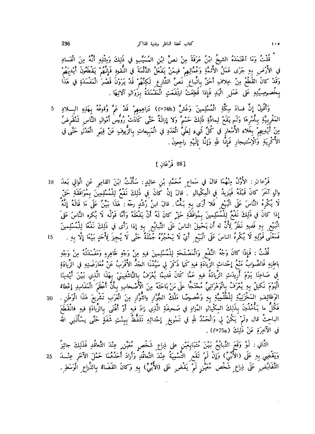 قلت: فإذا كان وجه النفع والمصلحة للمسلمين فيه من وجه ظاهره ومفسدته من وجه باطنه فالصواب منع إحداث الزيادة فيه كما ذكر لي سيدنا الجد الأقرب عن معارضته في الزيادة في صاعنا يوم أريدت الزيادة فيه عما كان قديما يعرف بالتاشفيني بهذا الذي بين أيدينا اليوم نكيل به يعرف بالوهراني محتجا على من باحثه من الأصحاب بأن أعظم المفاسد إعطاء الوظائف المخزنية للظلمية به وخصوصا ملك الجوار والثوار من العرب تشريع هذا الوطن. فكل ما يأخذون بذلك المكيال المزاد في صحيفة الذي زاد فيه أو أفتى بالزيادة فيه فانقطع الباحث قال ولم يكن لي والحمد لله في تسويغ إحداثه تلفظ ببنت شفة حتى يسألني الله في الآخرة عن ذلك.