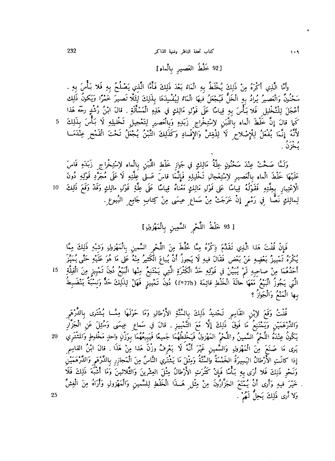 وأما الذي أكره من ذلك يخلط به الماء بعد ذلك فأما الذي يصلح به فلا بأس به. سحنون والعصير يراد به الخل فيجعل فيها الماء ليفسدها بذلك لئلا تصير خمرا ويكون ذلك أعجل للتخليل فلا بأس به قياسا على قول مالك في هذه المسألة. قال ابن رشد رحه هذا كما قال إن خلط الماء باللبن لاستخراج زبده وبالعصير لتعجيل تخليله لا بأس بذلك لأنه إنما يفعل للإصلاح لا للغش والإفساد وكذلك التبن يجعل تحت القمح عندما يخزن.