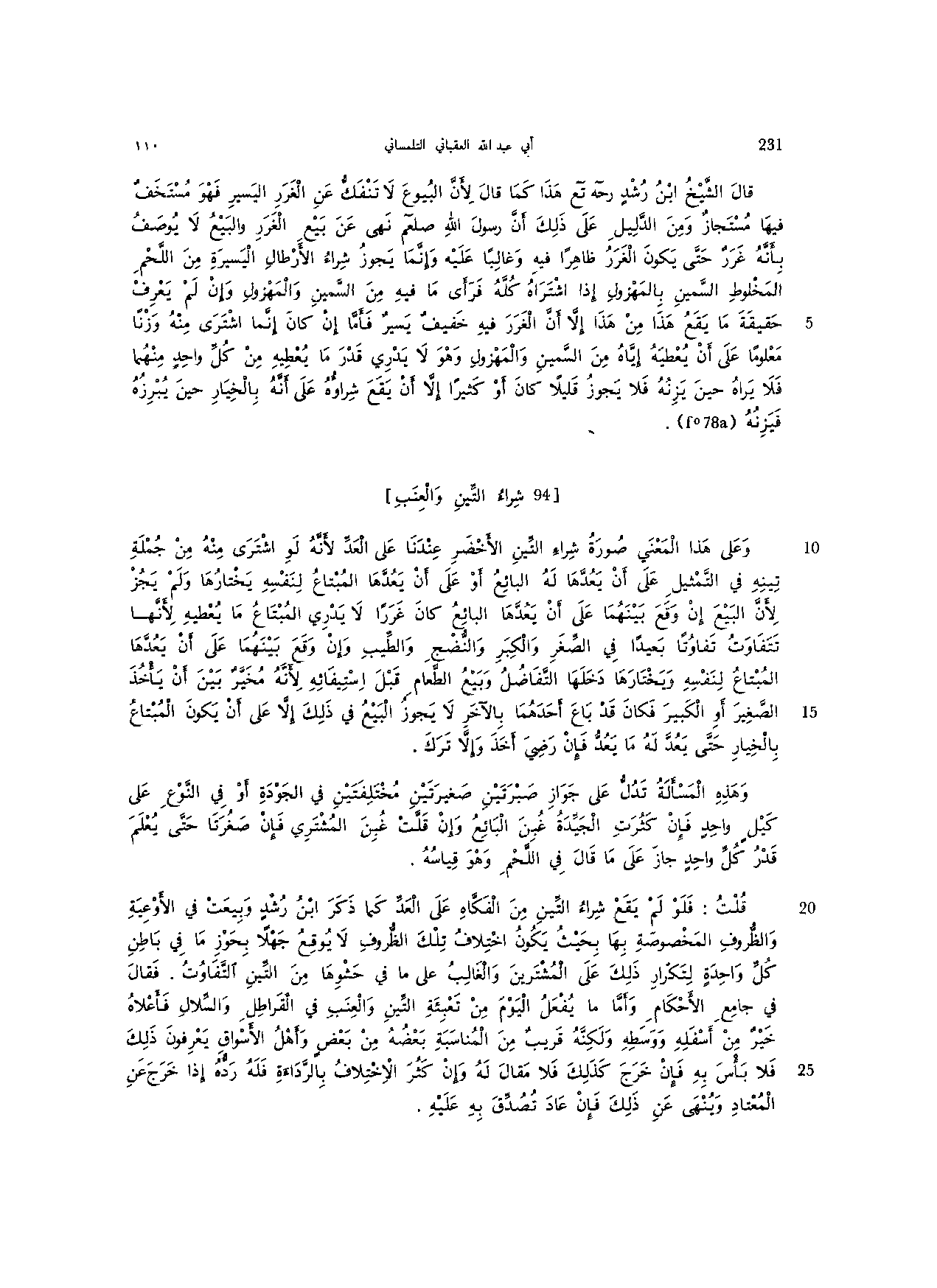 قلت: فلو لم يقع شراء التين من الفكاه على العد كما ذكر ابن رشد وبيعت في الأوعية والظروف المخصوصة بها بحيث يكون اختلاف تلك الظروف لا يوقع جهلًا بحوز ما في باطن كل واحدة لتكرار ذلك على المشترين والغالب على ما في حشوها من التين التفاوت. فقال في جامع الأحكام وأما ما يفعل اليوم من تعبئة التين والعنب في القراطل والسلال فأعلاه خير من أسفله ووسطه ولكنه قريب من المناسبة بعضه من بعض وأهل الأسواق يعرفون ذلك فلا بأس به فإن خرج كذلك فلا مقال له وإن كثر الاختلاف بالرداءة فله رده إذا خرج عن المعتاد وينهى عن ذلك فإن عاد تصدق به عليه.