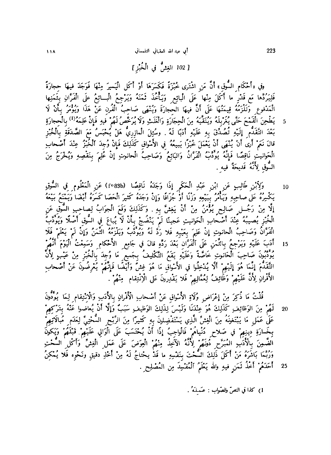 وفي " أحكام السوق" أن من اشترى خبزة فكسرها أو أكل اليسير منها فوجد فيها حجارة فليردها مع قدر ما أكل منها على البائع ويأخذ ثمنه ويرجع البائع على الفران بثمنها المدفوع وتلزمه قيمتها على أن فيها الحجارة وينهى صاحب الفرن عن هذا ويؤمر بأن لا يطحن القمح حتى يغربله وينقيه من الحجارة والغلث ولا يرخص لهم فيه فإن علمه بالحجارة بعد التقدم إليه تصدق به عليه أدبا له. وسئل المازري هل يحبس مع الصدقة بالخبز قال نعم أرى أن ينهى أن يعمل خبزا يبيعه في الأسواق كذلك فإن وجد الخبز عند أصحاب الحوانيت ناقصًا فإنه يؤدب الفران والبائع وصاحب الحانوت إن علم بنقصه ويخرج من السوق لأنه قديحة فيه.