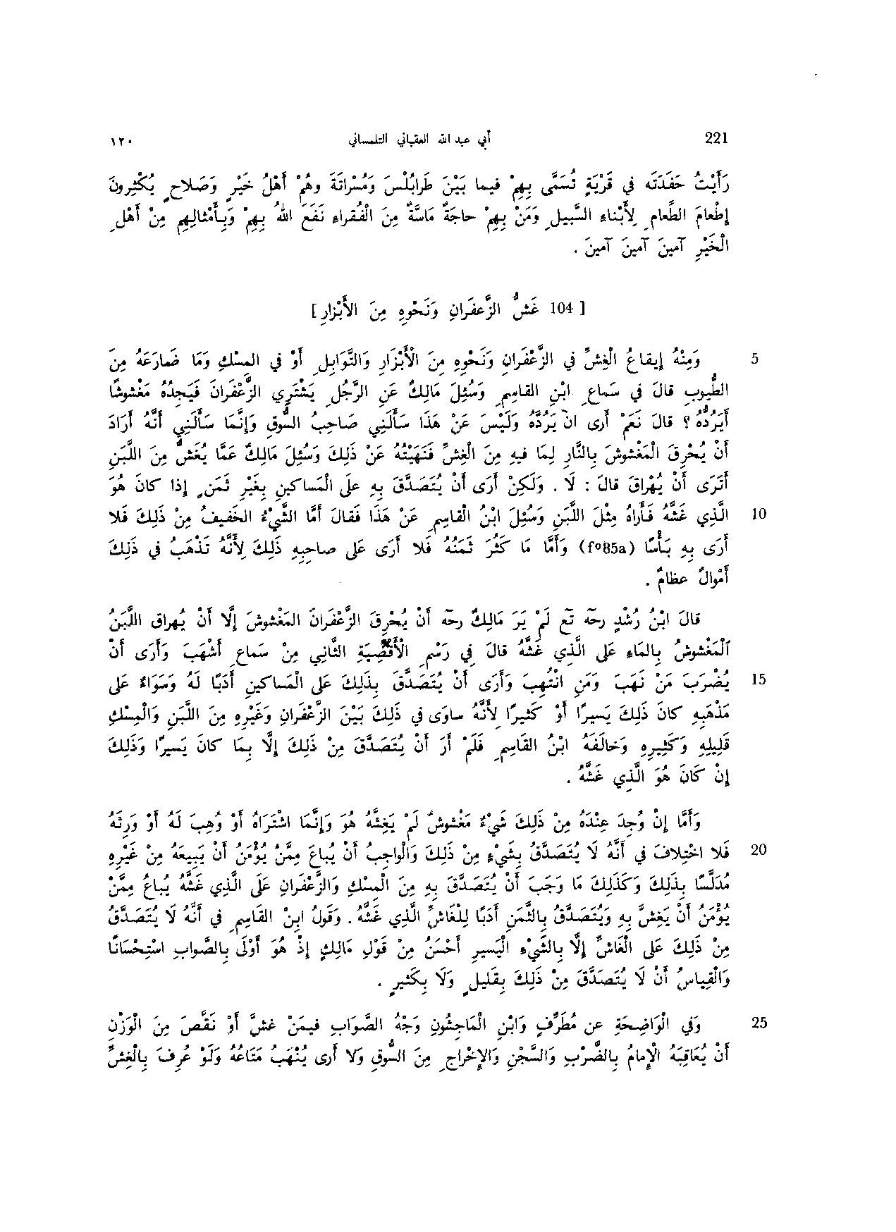 قال ابن رشد رحه تع لم ير مالك رحه أن يحرق الزعفران المغشوش إلا أن يهراق اللبن المغشوش بالماء على الذي غشه قال في رسم الأقضية الثاني من سماع أشهب وأرى أن يضرب من نهب ومن انتهب وأرى أن يتصدق بذلك على المساكين أدبا له وسواء على مذهبه كان ذلك يسيرا أو كثيرا لأنه ساوى في ذلك بين الزعفران وغيره من اللبن والمسك قليله وكثيره وخالفه ابن القاسم فلم أر أن يتصدق من ذلك إلا بما كان يسيرا وذلك إن كان هو الذي غشه.