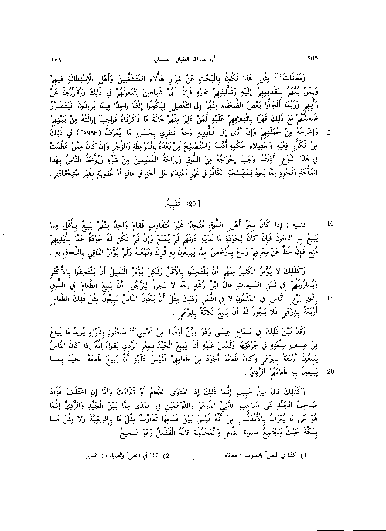وكذلك لا يؤمر الكثير منهم أن يلتحقوا بالأقل ولكن يؤمر القليل أن يلتحقوا بالأكثر ويساوونهم في ثمن المبيعات قال ابن رشد رحه لا يجوز للرجل أن يبيع الطعام في السوق بدون بيع الناس في المثمون لا في الثمن وذلك مثل أن يكون الناس يبيعون مثل ذلك الطعام أربعة بدرهم فلا يجوز له أن يبيع ثلاثة بدرهم.
