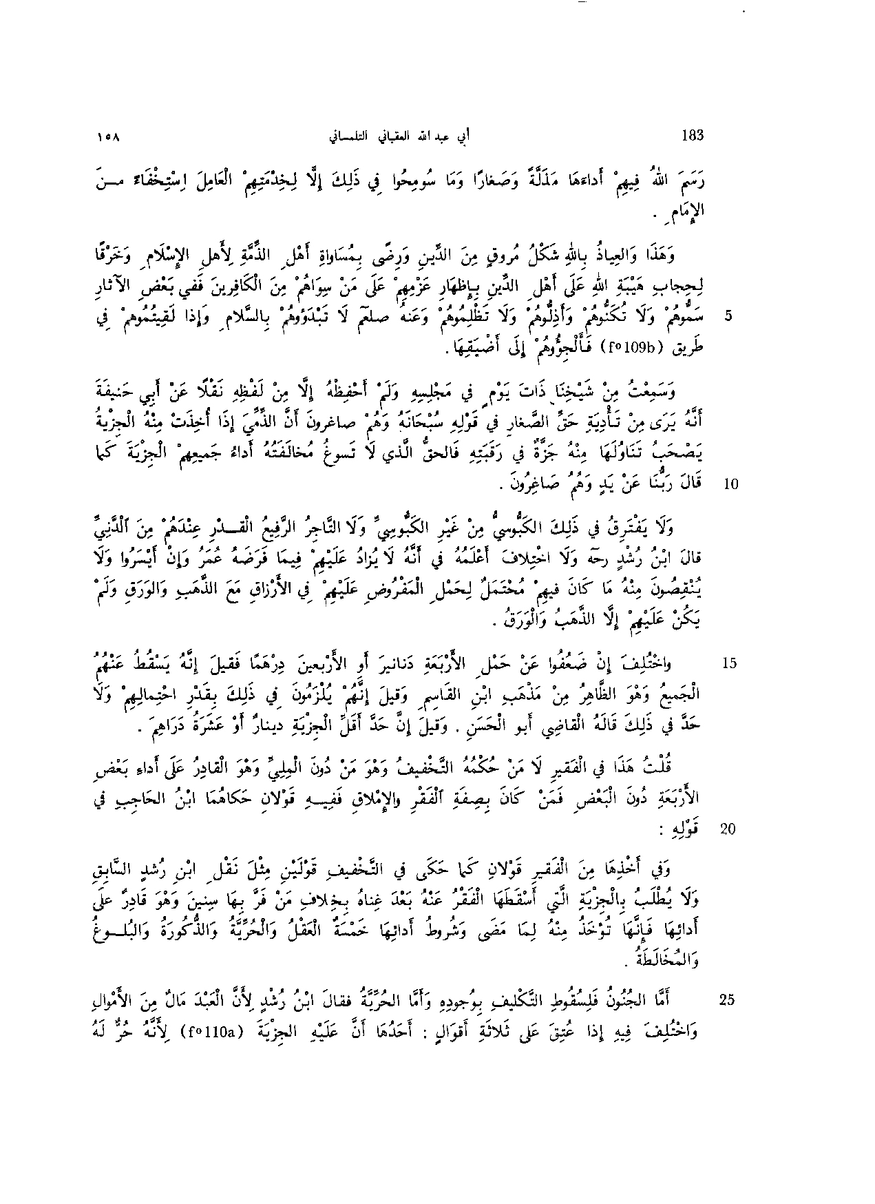 وفي أخذها من الفقير قولان كما حكى في التخفيف قولين مثل نقل ابن رشد السابق ولا يطلب بالجزية التي أسقطها الفقر عنه بعض غناه بخلاف من فر بها سنين وهو قادر على أدائها فإنها تؤخذ منه لما مضى وشروط أدائها خمسة العقل والحرية والذكورة والبلوغ والمخالطة.