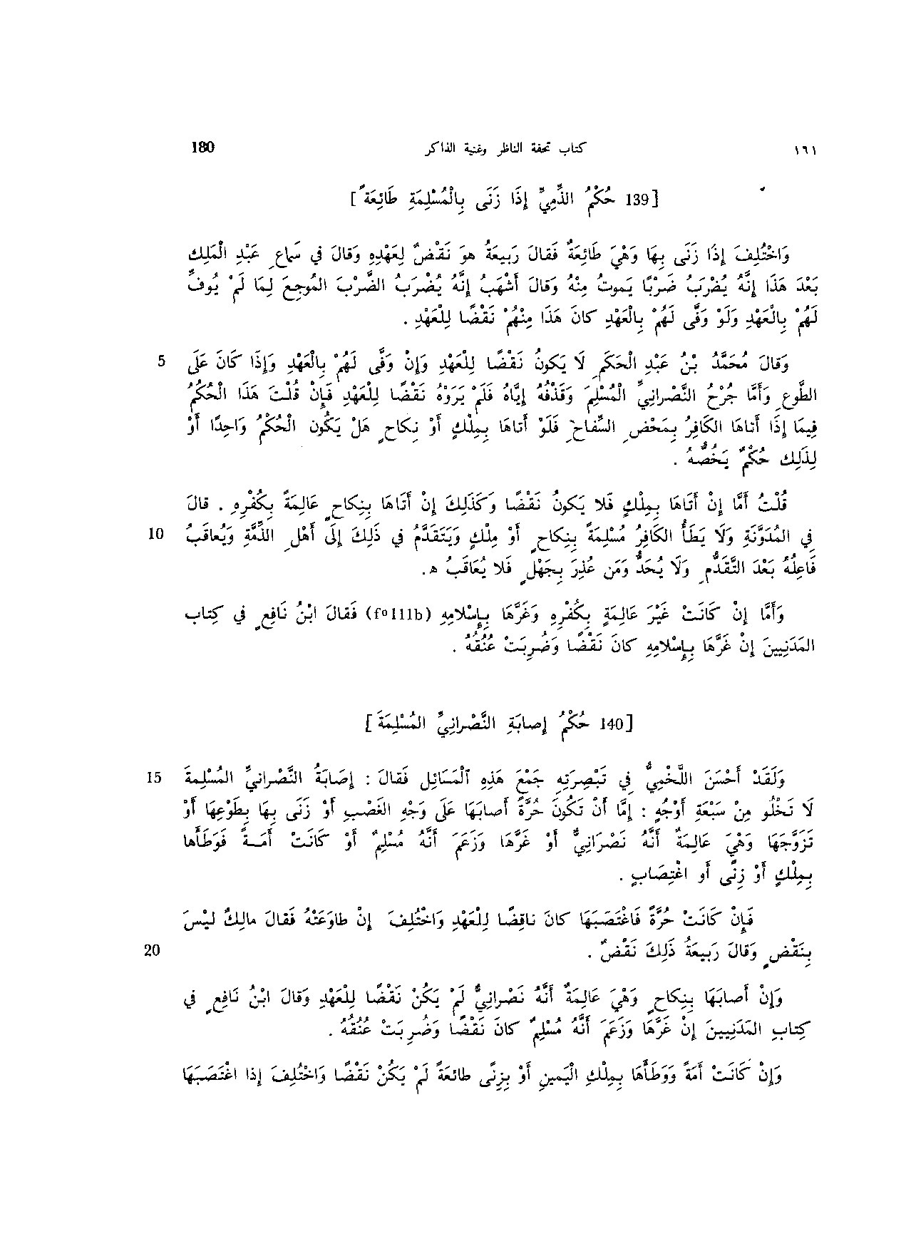 قلت أما إن أتاها بملك فلا يكون نقضا وكذلك إن أتاها بنكاح عالمة بكفره. قال في المدونة ولا يطأ الكافر مسلمة بنكاح أو ملك ويتقدم في ذلك إلى أهل الذمة ويعاقب فاعله بعد التقدم ولا يحد ومن عذر بجهل فلا يعاقب هـ.