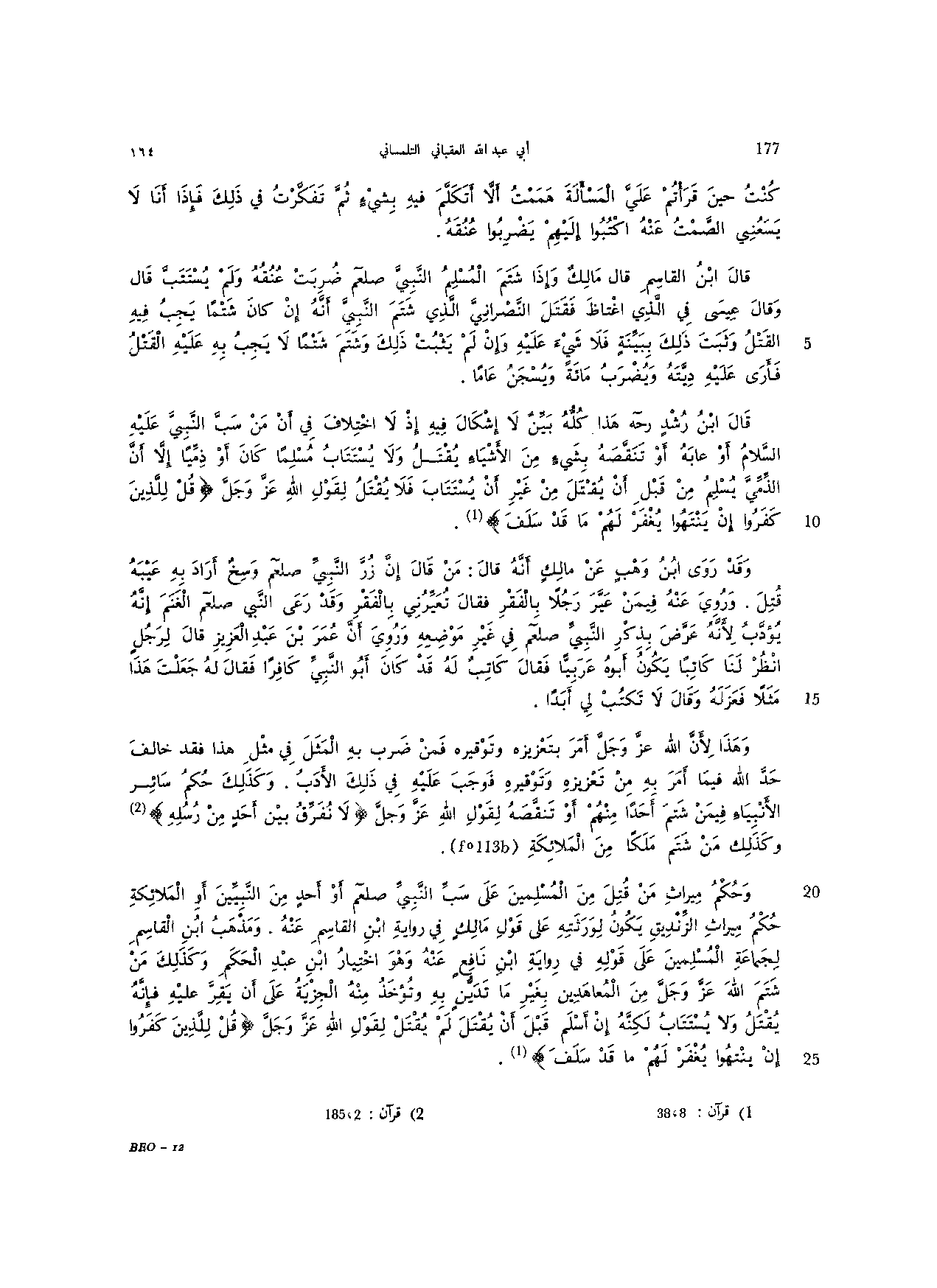 وحكم ميراث من قتل من المسلمين على سب النبي صلعم أو أحد من النبيين أو الملائكة حكم ميراث الزنديق يكون لورثته على قول مالك في رواية ابن القاسم عنه. ومذهب ابن القاسم لجماعة المسلمين على قوله في رواية ابن نافع عنه وهو اختيار ابن عبد الحكم وكذلك من شتم الله عز وجل من المعاهدين بغير ما تدين به وتؤخذ منه الجزية على أن يقر عليه فإنه يقتل ولا يستتاب لكنه إن أسلم قبل أن يقتل لم يقتل لقول الله عز وجل: {قل للذين كفروا إن ينتهوا يغفر لهم ما قد سلف}.