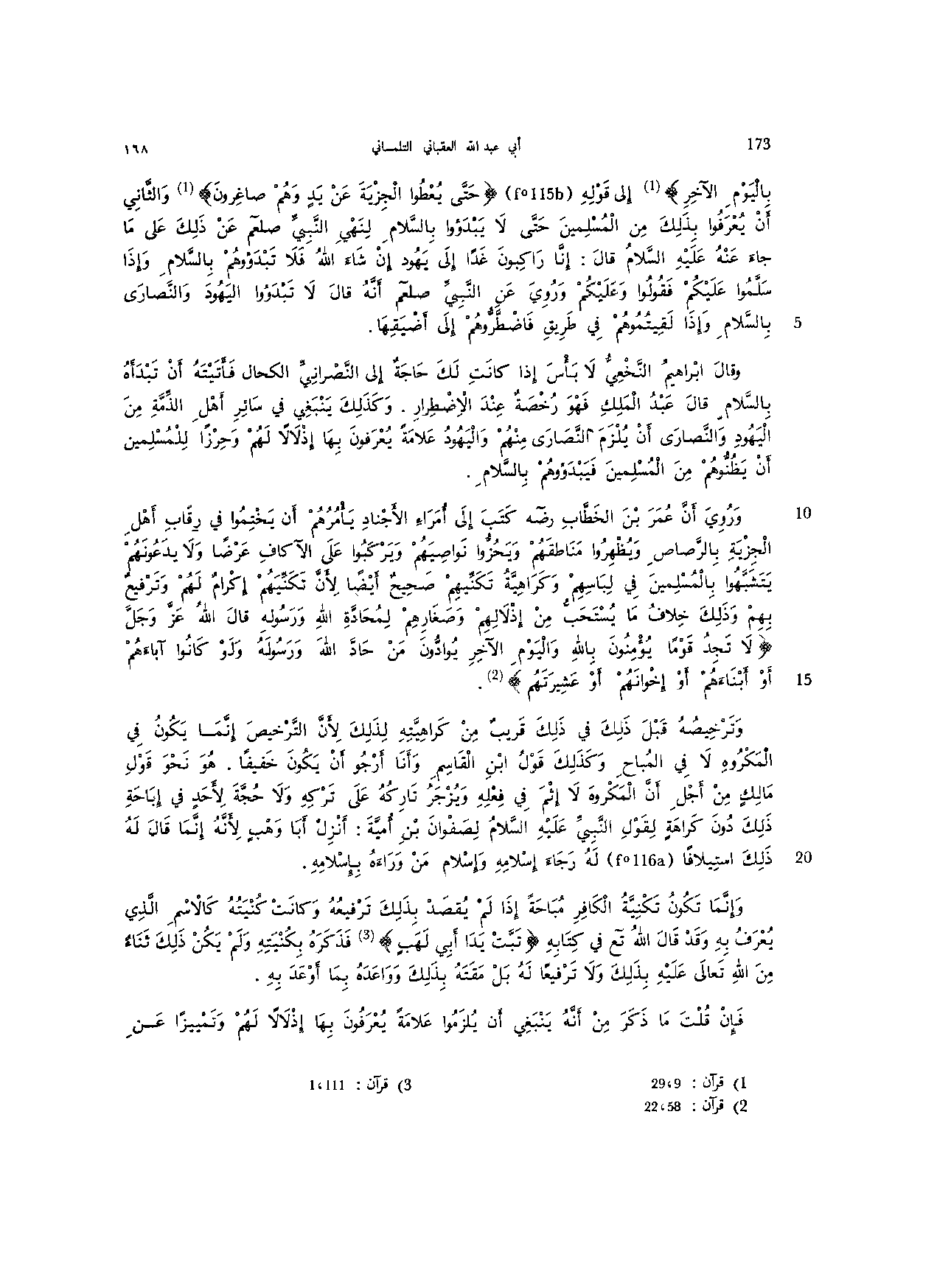 باليوم الآخر} إلى قوله: {حتى يعطوا الجزية عن يد وهم صاغرون} والثاني أن يعرفوا بذلك من المسلمين حتى لا يبدؤوا بالسلام لنهي النبي صلعم عن ذلك على ما جاء عنه عليه السلام قال: إنا راكبون غدًا إلى يهود إن شاء الله فلا تبدؤوهم بالسلام وإذا سلموا عليكم فقولوا وعليكم وروي عن النبي صلعم أنه قال لا تبدؤوا اليهود والنصارى بالسلام وإذا لقيتموهم في طريق فاضطروهم إلى أضيقها.
