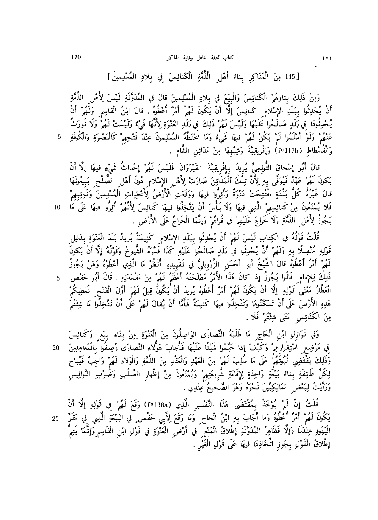 ومن ذلك بناؤهم الكنائس والبيع في بلاد المسلمين قال في المدونة ليس لأهل الذمة أن يحدثوا ببلد الإسلام كنائس إلا أن يكون لهم أمر أعطوه. قال ابن القاسم ولهم أن يحدثوها في بلد صالحوا عليها وليس لهم ذلك في بلد العنوة لأنها فيء وليست لهم ولا تورث عنهم ولو أسلموا لم يكن لهم فيها شيء وما اختطه المسلمون عند فتحهم كالبصرة والكوفة والفسطاط وإفريقية وشبهها من مدائن الشام.