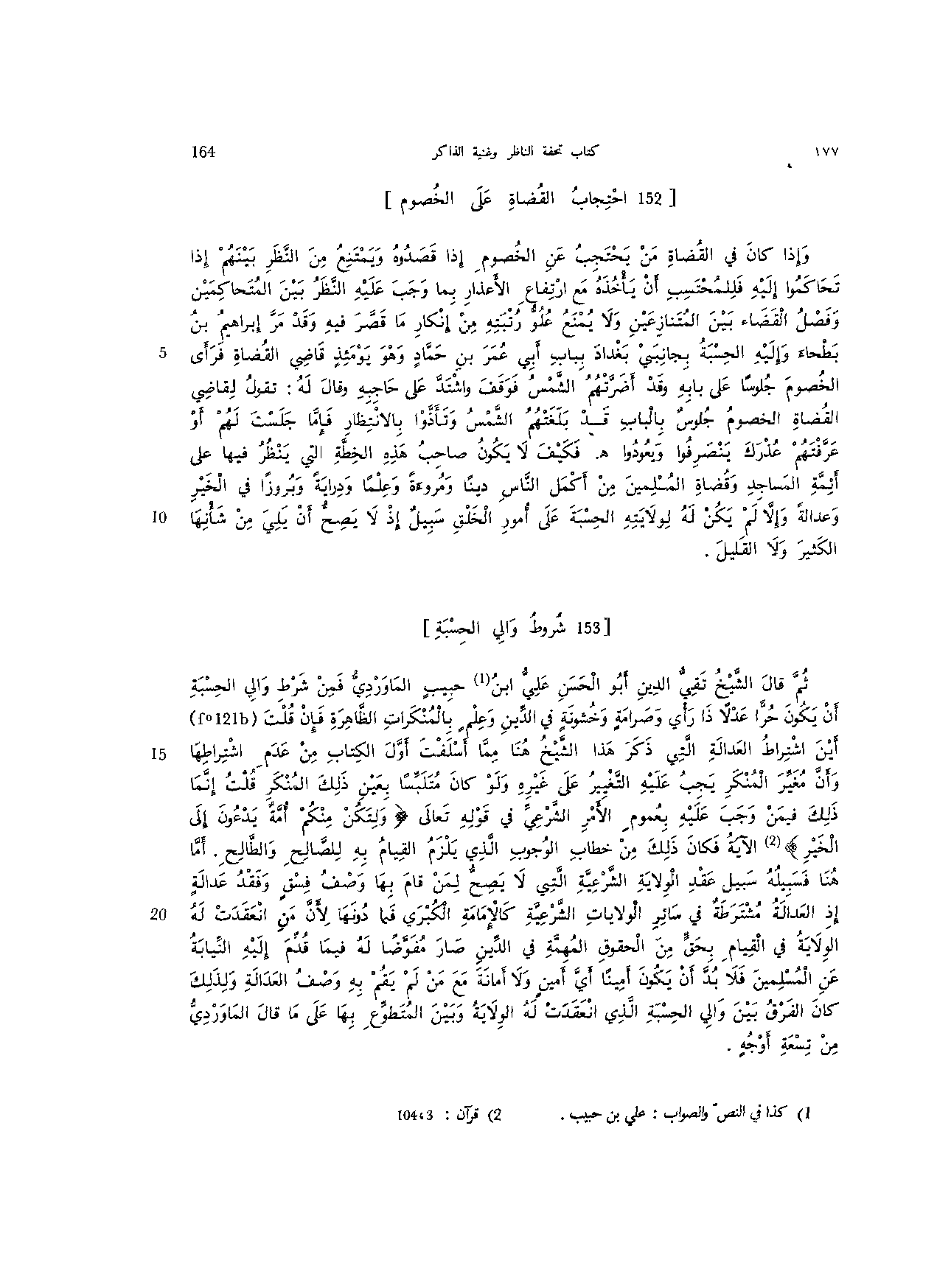 وإذا كان في القضاة من يحتجب عن الخصوم إذا قصدوه ويمتنع من النظر بينهم إذا تحاكموا إليه فللمحتسب أن يأخذه مع ارتفاع الأعذار بما وجب عليه النظر بين المتحاكمين وفصل القضاء بين المتنازعين ولا يمنع علو رتبته من إنكار ما قصر فيه وقد مر إبراهيم بن بطحاء وإليه الحسبة بجانبي بغداد بباب أبيع مر بن حماد وهو يؤمئذ قاضي القضاة فرأى الخصوم جلوسا على بابه وقد أضرتهم الشمس فوقف واشتد على حاجبيه وقال له: تقول لقاضي القضاة الخصوم جلوس بالباب قد بلغتهم الشمس وتأذوا بالانتظار فإما جلست لهم أو عرفتهم عذرك ينصرفوا ويعودوا هـ. فكيف لا يكون صاحب هذه الخطة التي ينظر فيها على أئمة المساجد وقضاة المسلمين من أكمل الناس دينا ومروءة وعلما ودراية وبروزا في الخير وعدالة وإلا لم يكن له لولايته الحسبة على أمور الخلق سبيل إذ لا يصح أن يلي من شأنها الكثير ولا القليل.