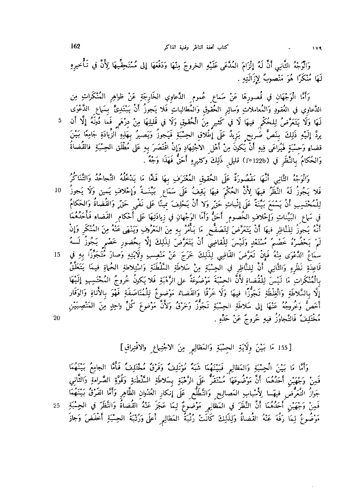 والوجه الثاني أنها مقصورة على الحقوق المعترف بها فأما ما يدخله التجاحد والتناكر فلا يجوز له النظر فيها لأن الحكم فيها يقف على سماع بينة وإحلاف يمين ولا يجوز للمحتسب أن يسمع بينة على إثبات حق ولا أن يحلف يمينا على نفي حق والقضاة والحكام في سماع البينات وإحلاف الخصوم أحق وأما الوجهان في زيادتها على أحكام القضاء فأحدهما أنه يجوز للناظر فيها أن يتعرض لتصفح ما يأمر به من المعروف وينهى عنه من المنكر وإن لم يحضره خصم مستعد وليس للقاضي أن يتعرض لذلك إلا بحضور خصم يجوز له سماع الدعوى منه فإن تعرض القاضي لذلك خرج عن منصب ولايته وصار متجوزا به في قاعدة نظره والثاني أن للناظر في الحسبة من سلاطة السلطنة واستلاطة الحماة فيما يتعلق بالمنكرات ما ليس للقضاة لأن الحسبة موضوعة على الرهبة فلا يكون خروج المحتسب إليها إلا بالسلاطة والغلظة تجوزا فيها ولا خرقا والقضاء موضوع للمناصفة فهو بالأناة والوقار أخص وخروجه عنها إلى سلاطة الحسبة تجوز وخرق ولأن موضوع كل واحد من المنصبين مختلف فالتجاوز فيه خروج عن حده.