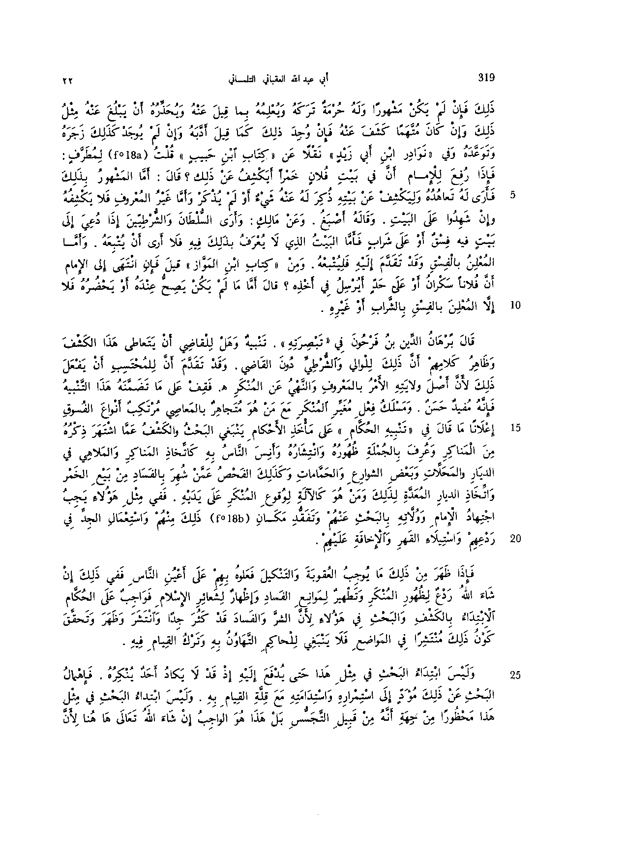 وليس ابتداء البحث في مثل هذا حتى يدفع إليه إذ قد لا يكاد أحد ينكره. فإهمال البحث عن ذلك مؤد إلى استمراره واستدامته مع قلة القيام به. وليس ابتداء البحث في مثل هذا محظورًا من جهة أنه من قبيل التجسس بل هذا هو الواجب إن شاء الله تعالى ها هنا لأن