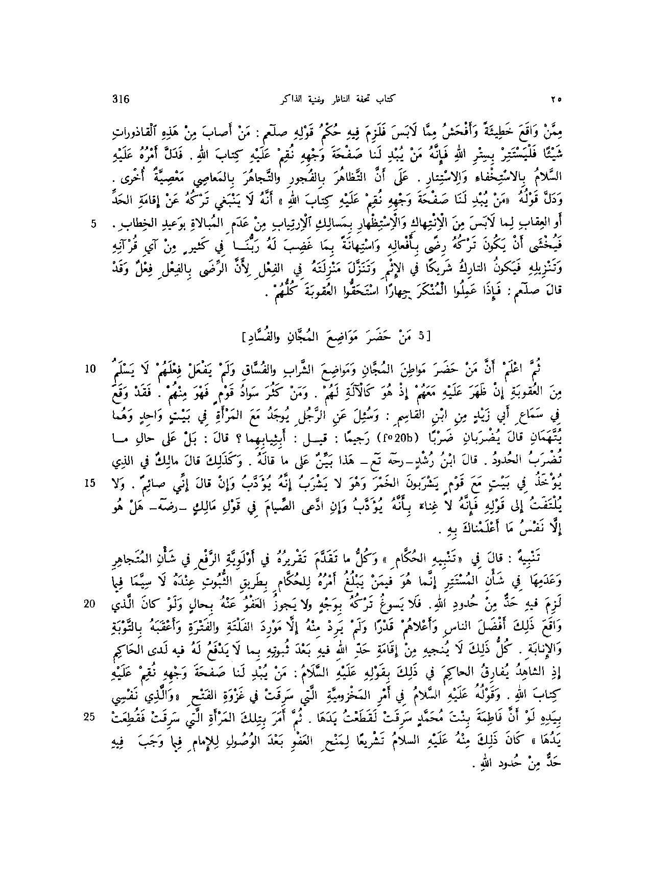 ثم اعلم أن من حضر مواطن المجان ومواضع الشراب والفساق ولم يفعل فعلهم لا يسلم من العقوبة إن ظهر عليه معهم إذ هو كالآلة لهم. ومن كثر سواد قوم فهو منهم. فقد وقع في سماع أبي زيد من ابن القاسم: وسئل عن الرجل يوجد مع المرأة في بيت واحد وهما يتهمان قال يضربان ضربًا رجيمًا: قيل: أبثيابهما؟ قال: بل على حل ما تضرب الحدود. قال ابن رشد -رحه تع- هذا بين على ما قاله. وكذلك قال مالك في الذي يؤخذ في بيت مع قوم يشربون الخمر وهو لا يشرب إنه يؤدب وإن قال إني صائم. ولا يلتفت إلى قوله فإنه لا غناء بأنه يؤدب وإن ادعى الصيام في قول مالك رضه هل هو إلا نفس ما أعلمناك به.