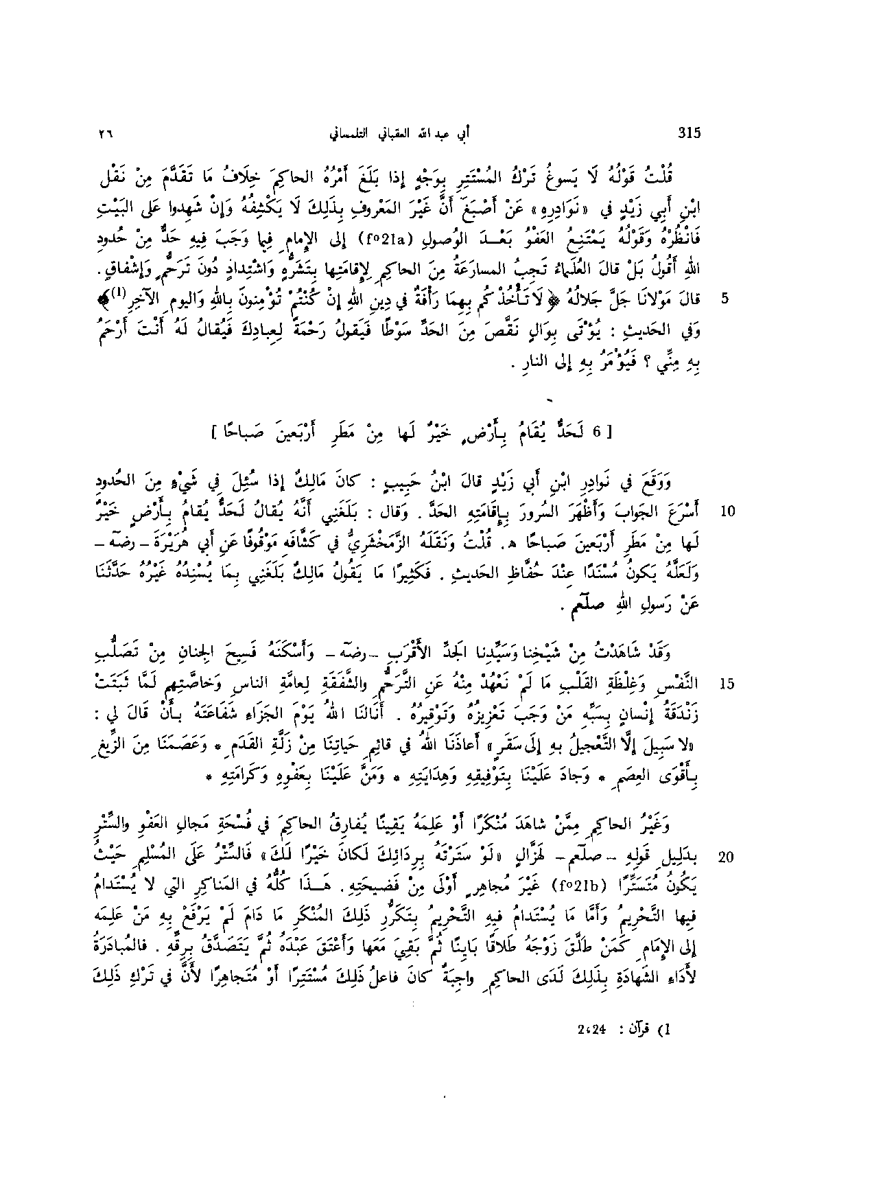 ووقع في نوادر ابن أبي زيد قال ابن حبيب: كان مالك إذا سئل في شيء من الحدود أسرع الجرب وأظهر السرور بإقامته الحد. وقال: بلغني أنه يقال لحد يقام بأرض خير لها من مطر أربعين صباحا هـ. قلت ونقه الزمخشري في كشافه موقوفًا عن أبي هريرة –رضه- ولعله يكون مسندًا عند حفاظ الحديث. فكثيرًا ما يقول مالك بلغني بما يسنده غيره حدثنا عن رسول صلعم.