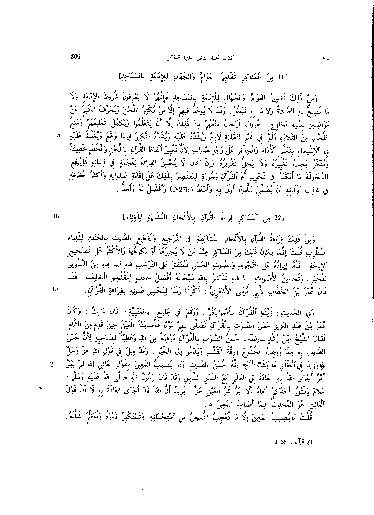 ومن ذلك تقديم العوام والجهال للإمامة بالمساجد فإنهم لا يعرفون شروط الإمامة ولا ما تصح به الصلاة ولا ما به تبطل. وقد لا يوجد فيهم إلا من يكثر اللحن ويحرف الكلم عن مواضعه بسوء مخارج الحروف فيجب منعهم من ذلك إلا أن يتعلموا ويكمل تعليمهم منع اللحان من التلاوة ولو في غير الصلاة لازم ويشدد عليه ويشدد النكير فيما واقع ويغلظ عليه في الاشتغال بتعلم الأداء والحفظ على وجه الصواب لأن تغيير ألفاظ القرآن باللحن والخطأ خطيئة ومنكر يجب تغييره ولا يحل تقريره وإن كان لا يحسن القراءة لعجمة في لسانه فليوقع المحاولة ما أمكنه في تجويد أم القرآن وسورة ليقتصر بذلك على إقامة صلواته وأكثر حظوظه في غالب أوقاته أن يصلي مأمومًا أولى به وأسعد وأفضل له وأسد.