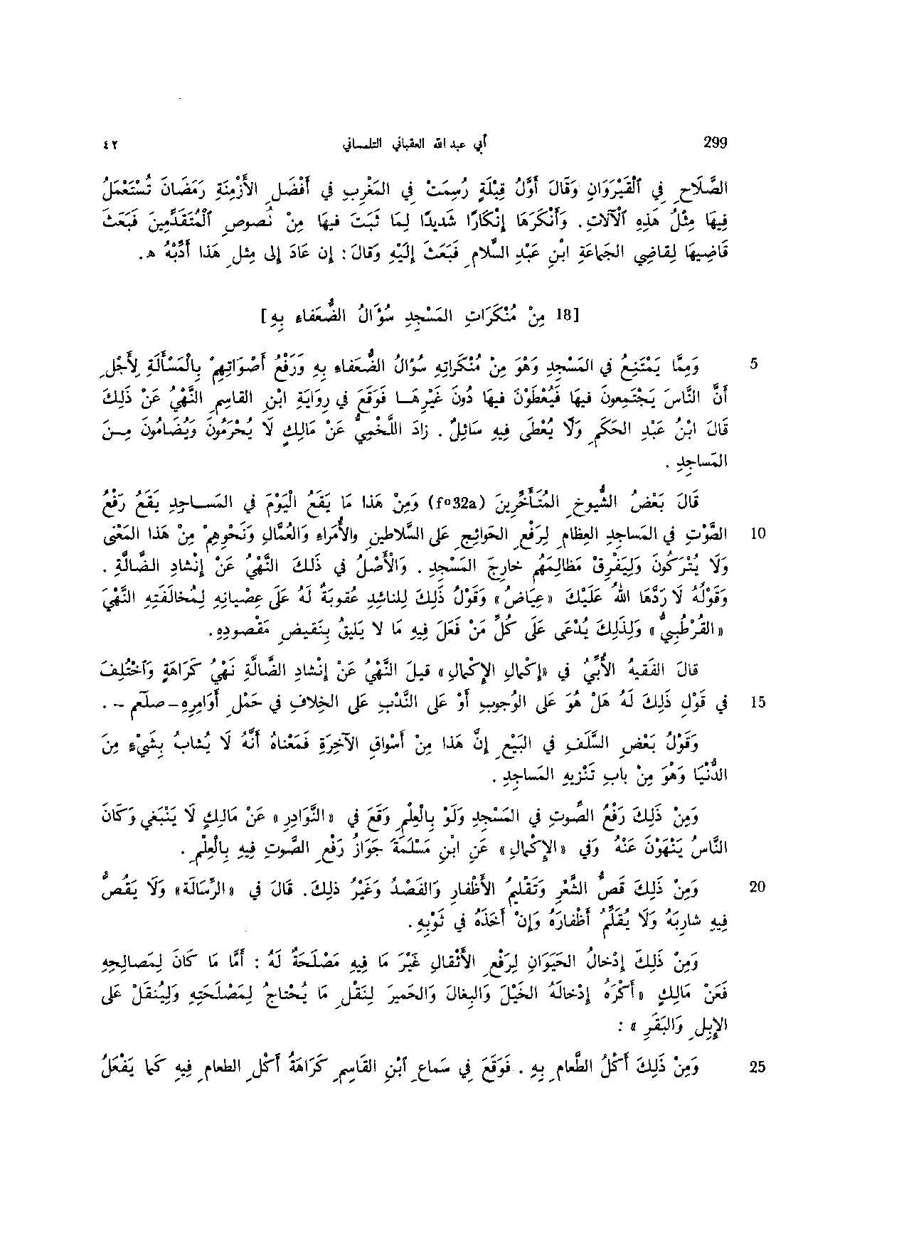 ومن ذلك رفع الصوت في المسجد ولو بالعلم وقع في "النوادر" عن مالك لا ينبغي وكان الناس ينهون عنه وفي " الإكمال" عن ابن مسلمة جواز رفع الصوت فيه بالعلم.