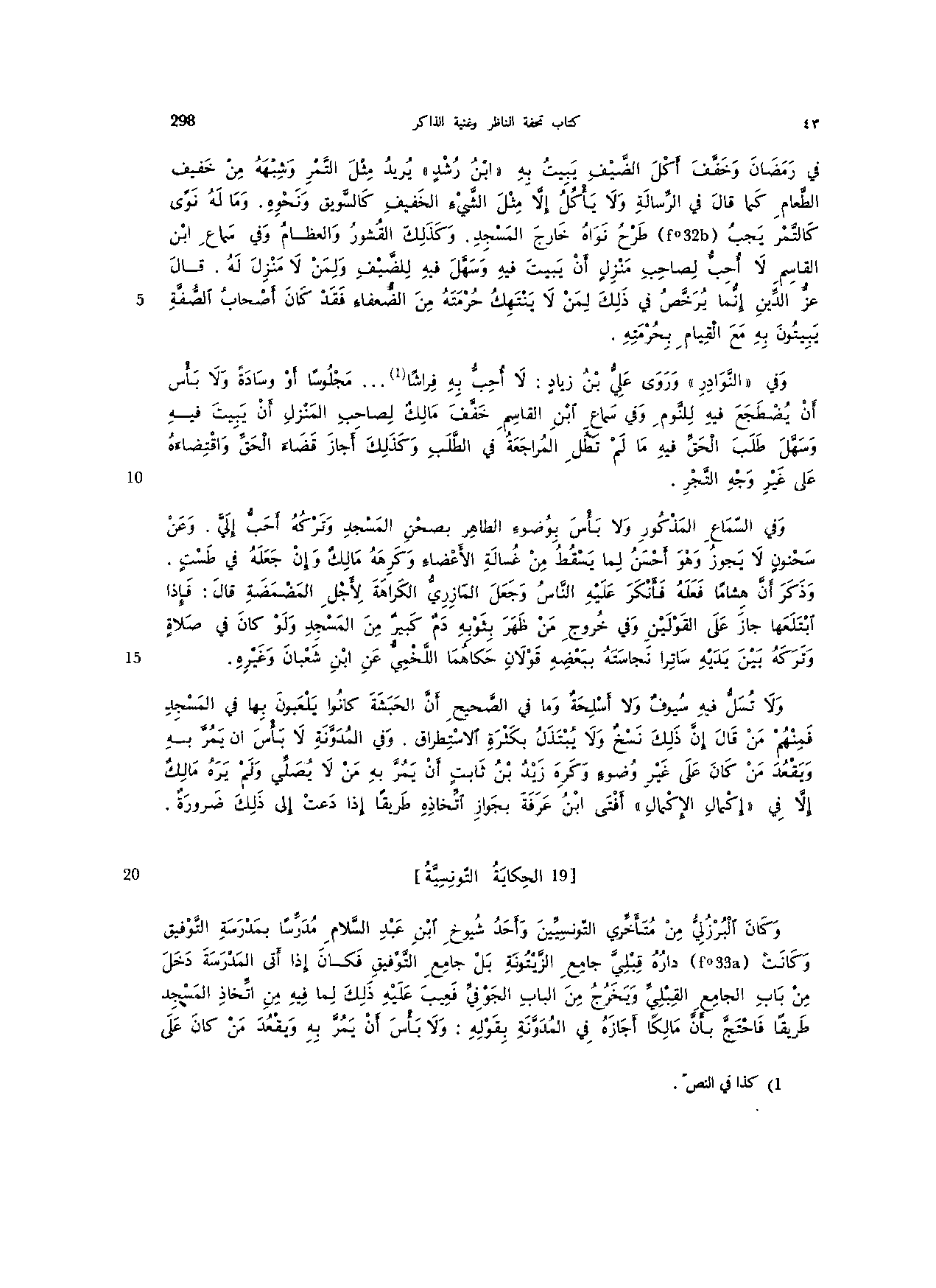 وفي "النوادر" وروى علي بن زياد: لا أحب به فراشا ... مجلوسًا أو وسادة ولا بأس أن يضطجع فيه للنوم وفي سماع ابن القاسم خفف مالك لصاحبه المنزل أن يبيت فيه وسهل طلب الحق فيه ما لم تطل المراجعة في الطلب وكذلك أجاز قضاء الحق واقتضاءه على غير وجه التجر.