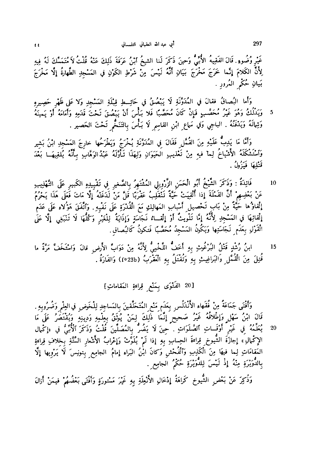 وأفتى جماعة من فقهاء الأندلس بعدم منع المتحلقين بالمساجد للخوض في العلم وضروبه. قال ابن سهل وإطلاقه غير صحيح إنما ذلك لمن يوثق بعلمه ودينه ويقتصر على ما يعلمه في غير أوقات الصلوات. حين لا يضر بالمصلين قلت وذكر الأبى في "إكمال الإكمال" إجازة الشيوخ قراء الحساب به إذا لم يلوث وإعراب الأشعار الستة بخلاف قراءة المقامات لما فيها من الكذب والفحش وكان ابن البراء إمام الجامع بتونس لا يرويها إلا بالدوبرة منه إذ ليس للدوبرة حكم الجامع.