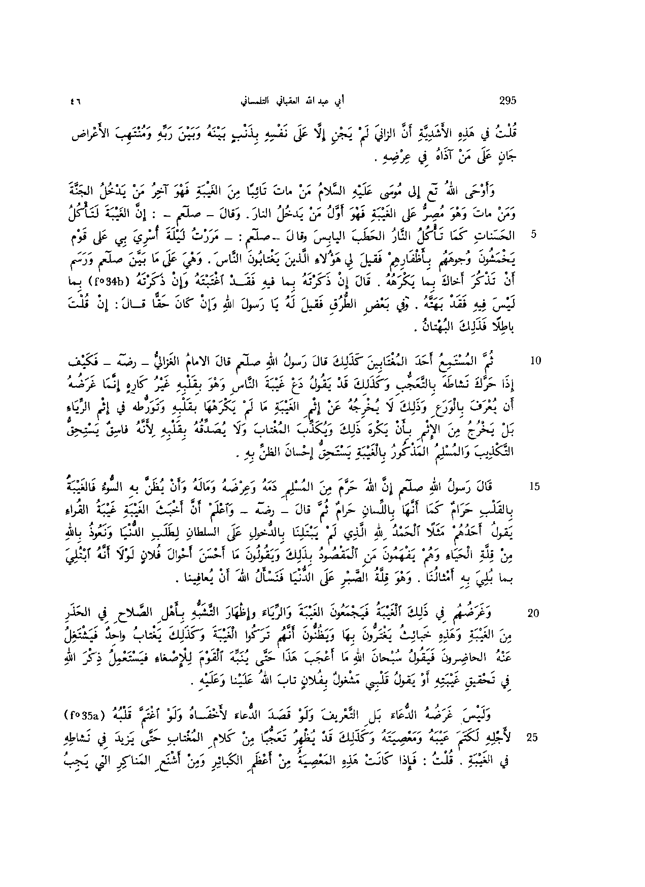 قال رسول الله صلعم إن الله حرم من المسلم دمه وعرضه وماله وأن يظن به السوء فالغيبة بالقلب حرام كما أنها باللسان حرام ثم قال –رضه- واعلم أن أخبث الغيبة غيبة الفراء يقول أحدهم مثلا الحمد لله الذي لم يبتلنا بالدخول على السلطان لطلب الدنيا ونعوذ بالله من قلة الحياء وهم يفهمون من المقصود بذلك ويقولون ما أحسن أحوال فلان لولا أنه ابتلي بما بلي به أمثالنا وهو قلة الصبر على الدنيا فنسأل الله أن يعاقبنا.