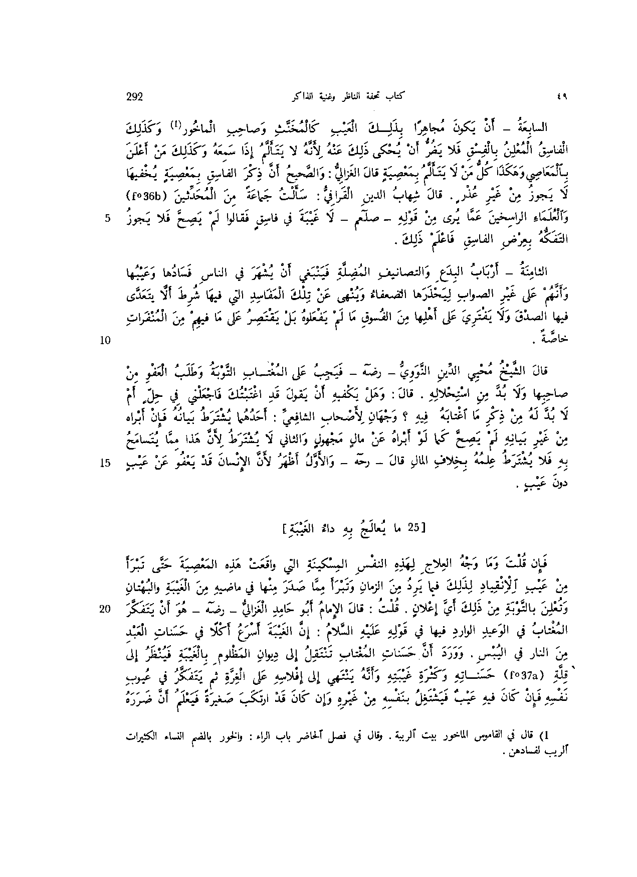 فإن قلت وما وجه العلاج لهذه النفس المسكينة التي واقعت هذه المعصية حتى تبرأ من عيب الانقياد لذلك فيما يرد من الزمان وتبرأ مما صدر منها من ماضيه من الغيبة والبهتان وتعلن بالتوبة من ذلك أي إعلان. قلت: قال الإمام أبو حامد الغزالي –رضه- هو أن يتفكر المغتاب في الوعيد الوارد فيها في قوله عليه السلام: إن الغيبة أسرع أكلًا في حسنات العبد من النار في اليبس. وورد أن حسنات المغتاب تنتقل إلى ديوان المظلوم بالغيبة فينظر إلى قلة حسناته وكثرة غيبته وأنه ينتهي إلى إفلاسه على الغرة ثم يتفكر في عيوب نفسه فإن كان فيه عيب فيشتغل بنفسه من غيره وإن كان قد ارتكب صغيرة فيعلم أن ضرره
